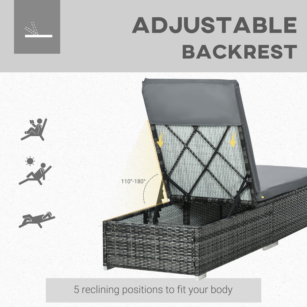 Outsunny PE Rattan Sun Loungers set of 2 with Cushion, Outdoor 2 Pieces Garden Sunbed Furniture with 5-Level Recliner Backrest, Reclining Patio Wicker Bed Chair, Grey - Grey