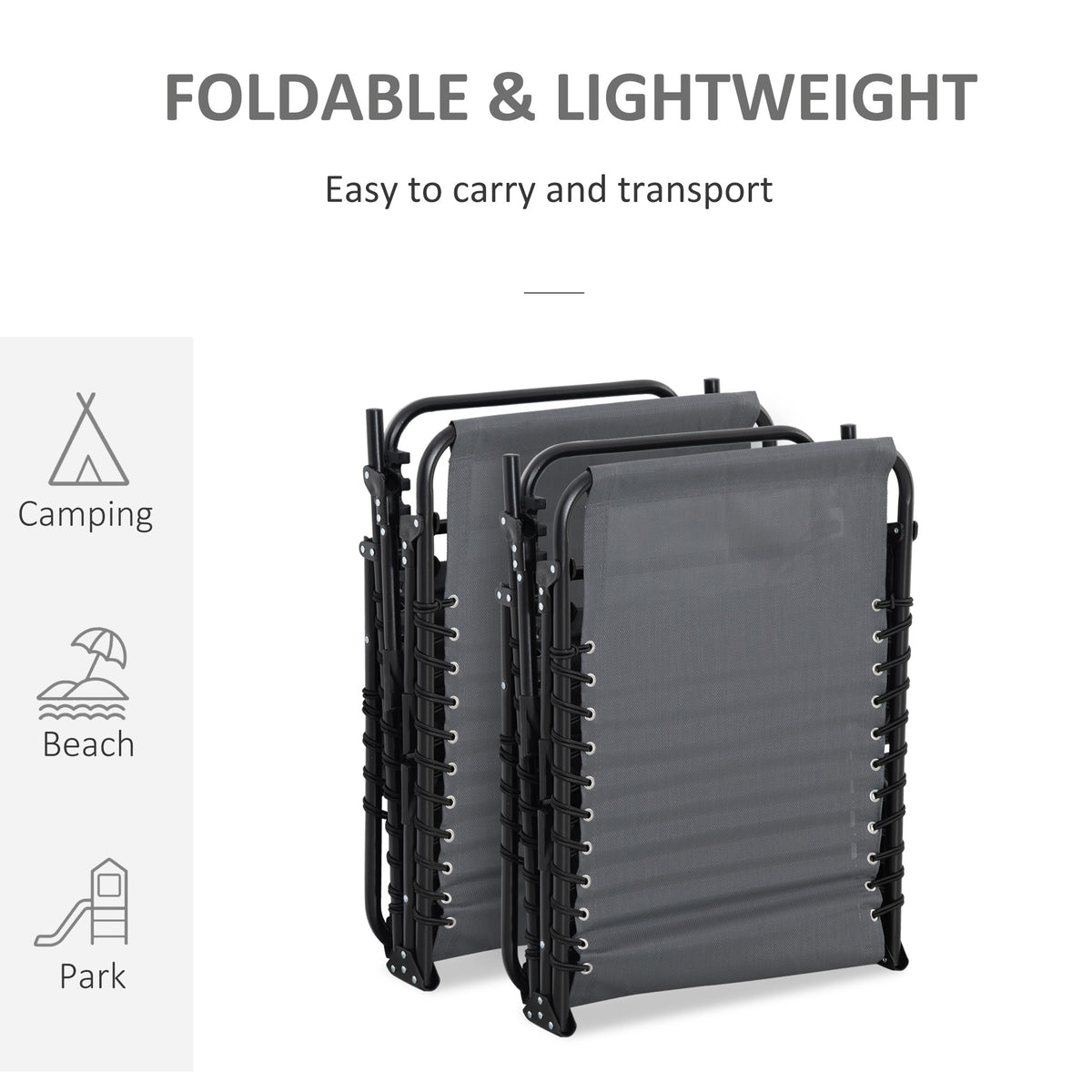 Outsunny Portable Sun Lounger Set of 2, Folding Camping Bed Cot, Reclining Lounge Chair 5-position Adjustable Backrest with Side Pocket, Pillow for Patio Garden Beach Pool, Grey - Grey