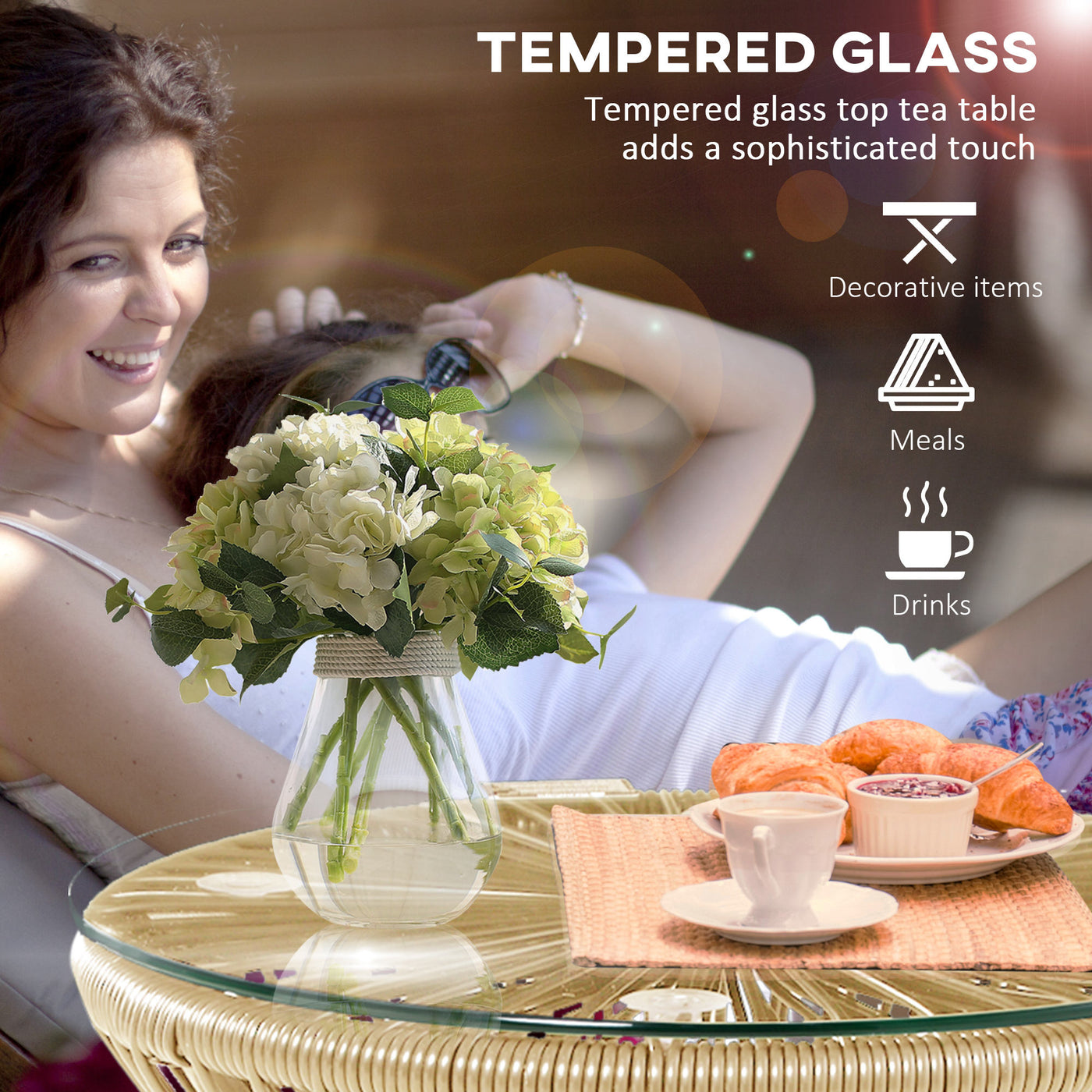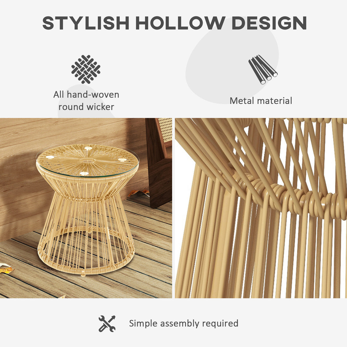Outsunny Round End Table, Rattan Side Table, Hollow Drum Design Coffee Table w/ Glass Tabletop for Patio, Garden, Balcony Natural - Natural wood finish