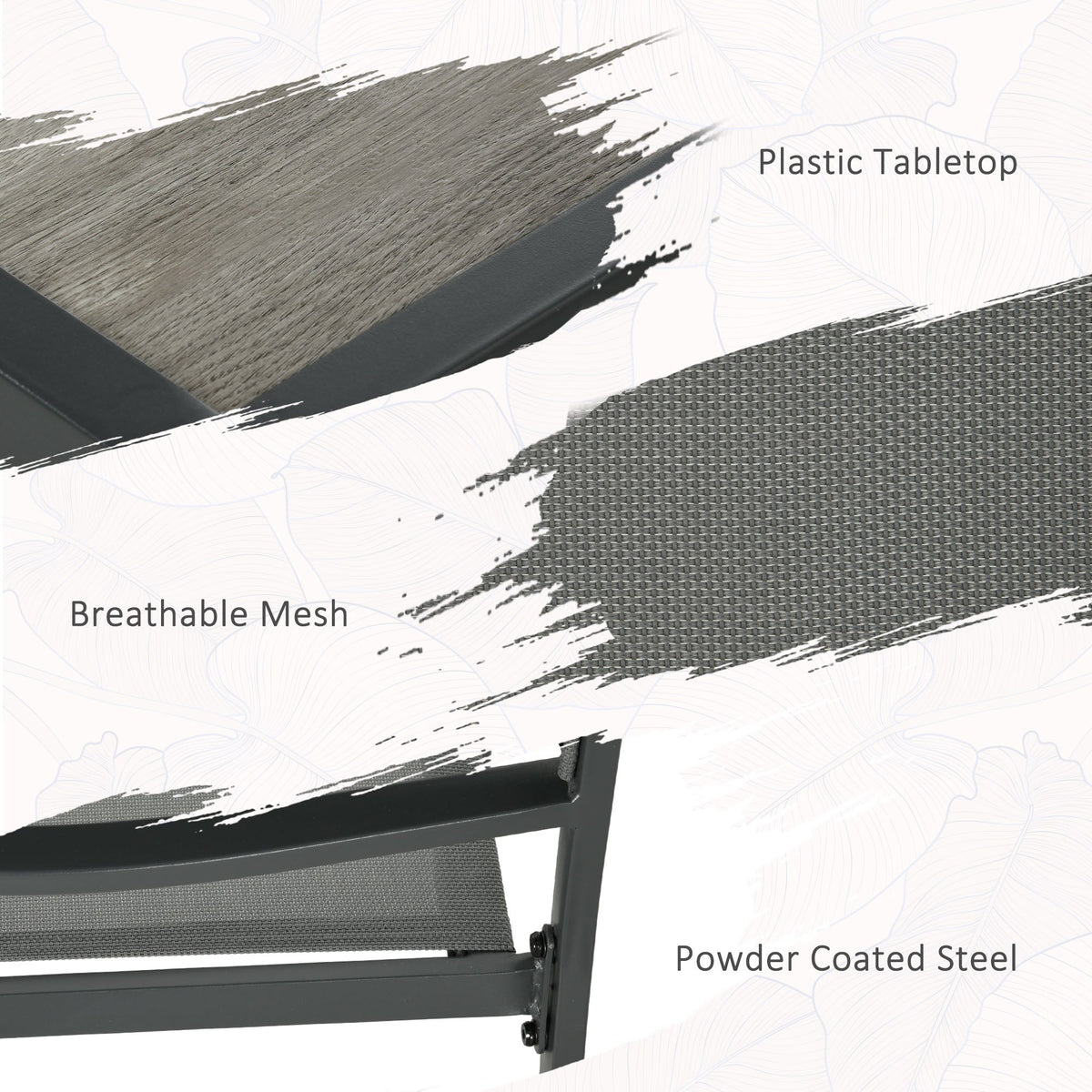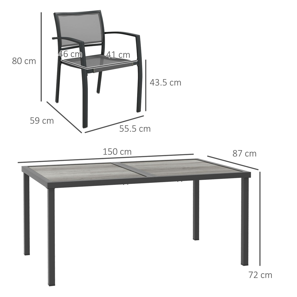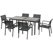 Let the rustic design of this Outsunny dining set effortlessly blend in with your outdoors. The multi-tone faded tabletop is beautiful and eye-catching; matches the overall dark aesthetic of the set. Powder coated steel frames mean strong and supportive pieces; the chairs have mesh fabric to hold you comfortably. Set comes with one large dining table and six chairs - enjoy outdoors with company.