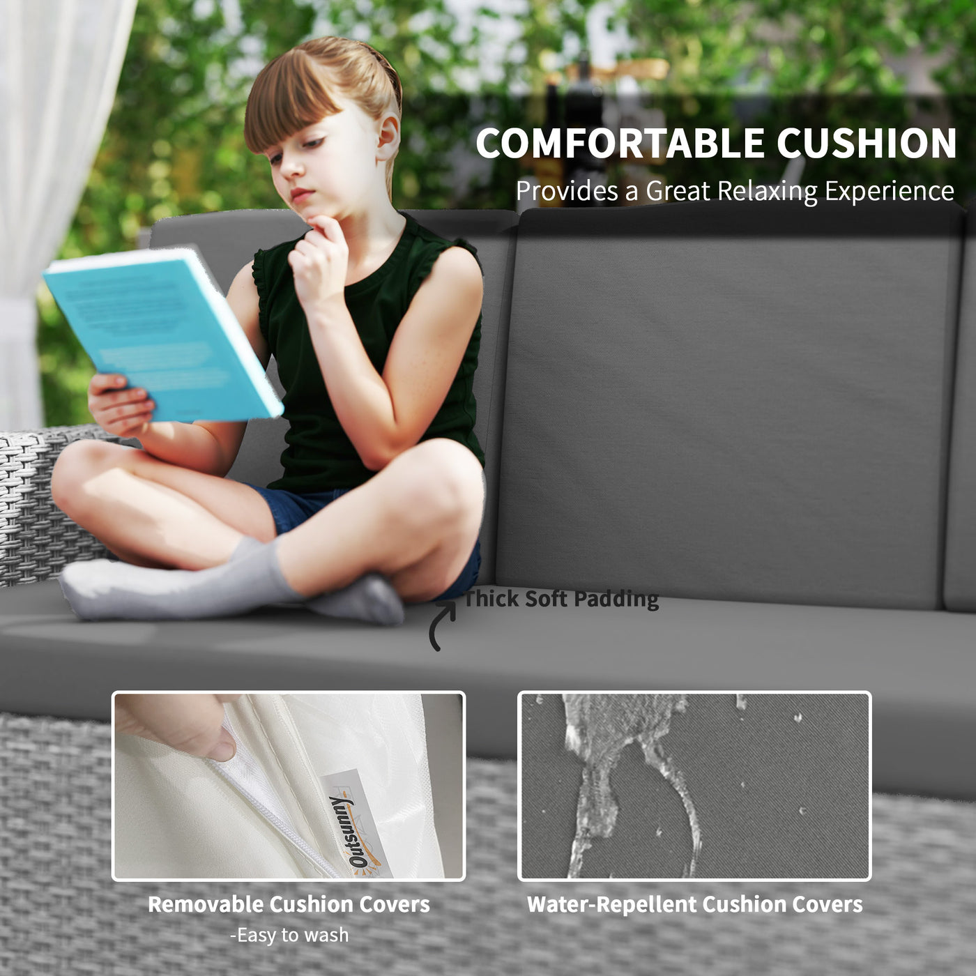 This Outsunny seven-piece rattan sofa set seats up to ten people. Bring family and friends together in comfort and style. Each piece has a steel frame for a strong core, wrapped in plastic rattan for double the durability. Cushions for comfort, with removable and washable covers. The table is expandable to cater for more people when required.