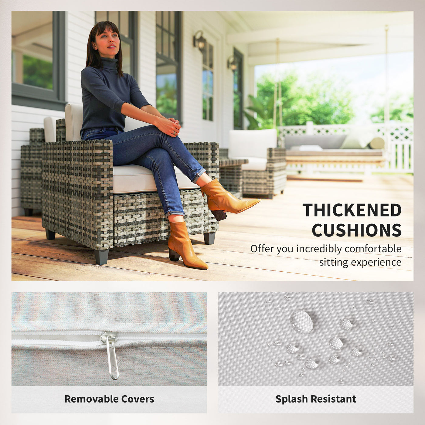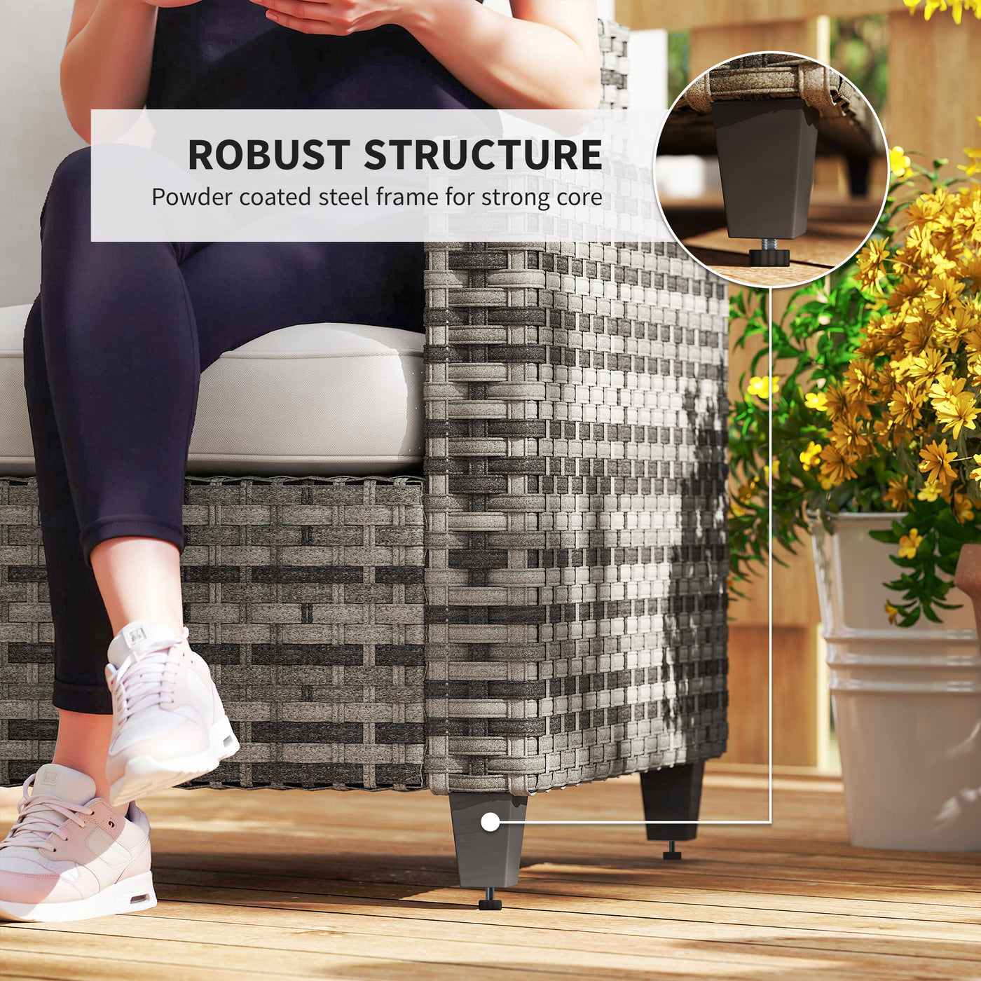 Favourite company gathers round and relaxes in comfort, with this Outsunny six-piece garden sofa set. It comes with two corner chairs, a middle chair, two armchairs and a coffee table - a modular set so you can fix to any shape or position you want. Powder coated steel frames mean a strong core, wrapped in plastic wicker for a stylish and robust rattan look. Complete with seat and back cushions for comfort.
