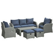 Outsunny Six-piece Outdoor Rattan Dining Set, Outdoor Sofa Set with Reclining Armchairs and Mental Frame, Blue - Blue