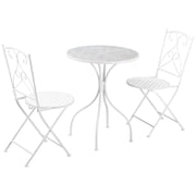 This Outsunny outdoor bistro set is ready for the seasons ahead. It includes a round side table with engraved scrolled, with pairs with the scrolling on the chair backs - pretty and elegant. All pieces are made from metal, so they're strong and tough and will support you when being used. Both the chairs and table are foldable - so when you're done, you can carry and store them easily. A great way to enjoy the sunshine with company.