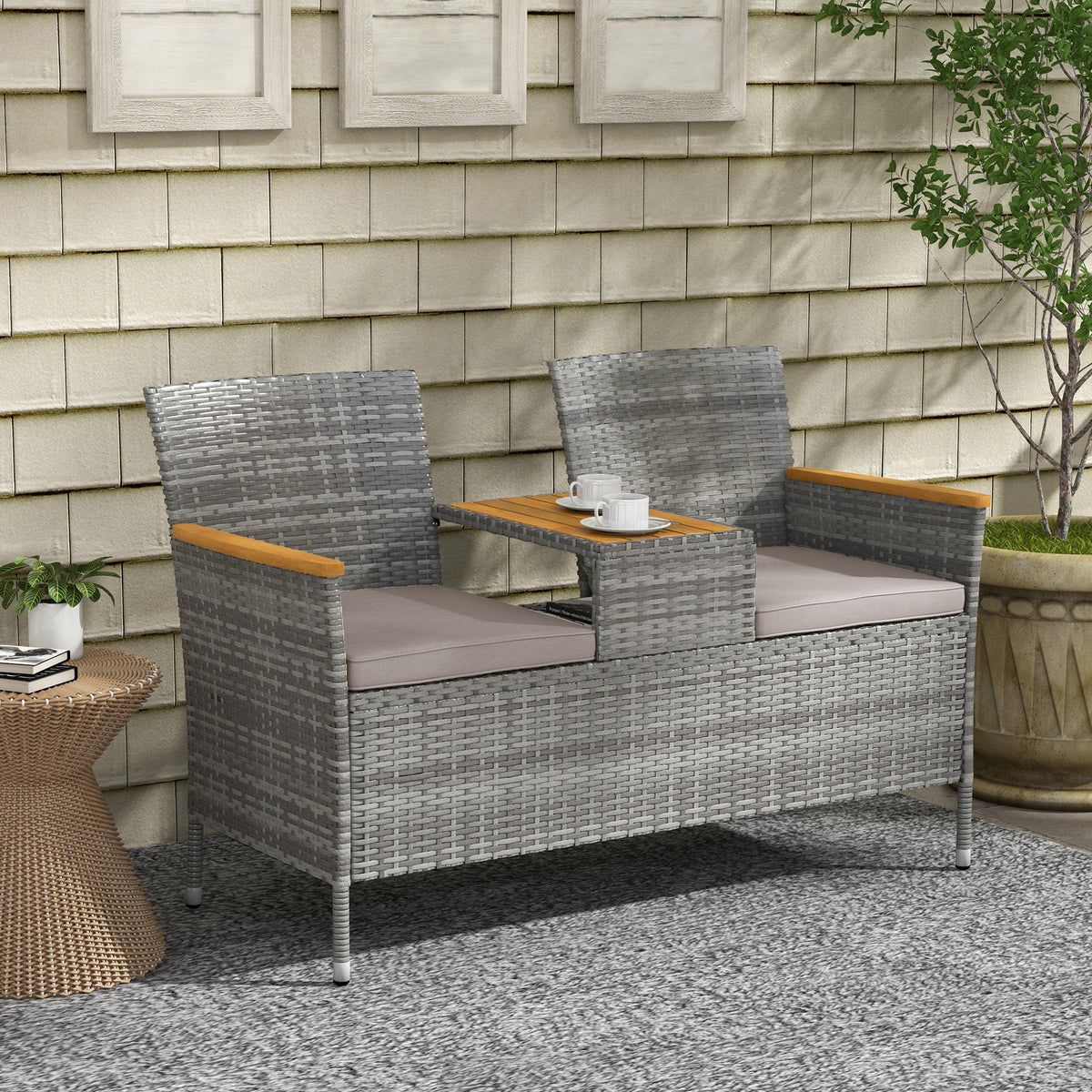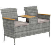 Company made comfortable with this Outsunny two-seat bench. Combining two individual seats and a middle table, you can relax in your outdoor space with a friend. The middle table gives handy close-by space for both of you. Strong acacia wood panels on the table and armrests give a natural beauty touch. A steel frame for a strong core, wrapped in stylish and plastic wicker. Complete with seat cushions to keep you comfortable.