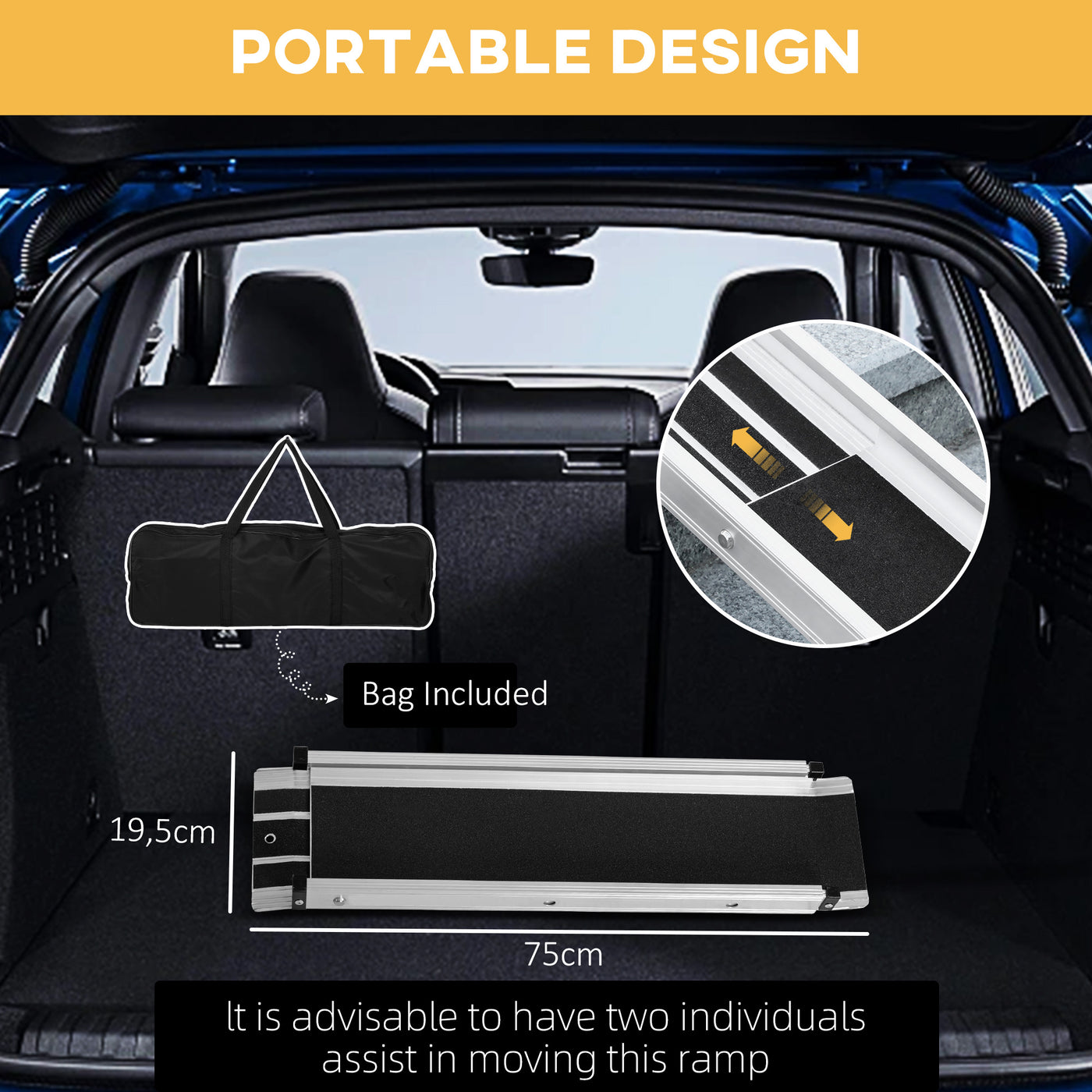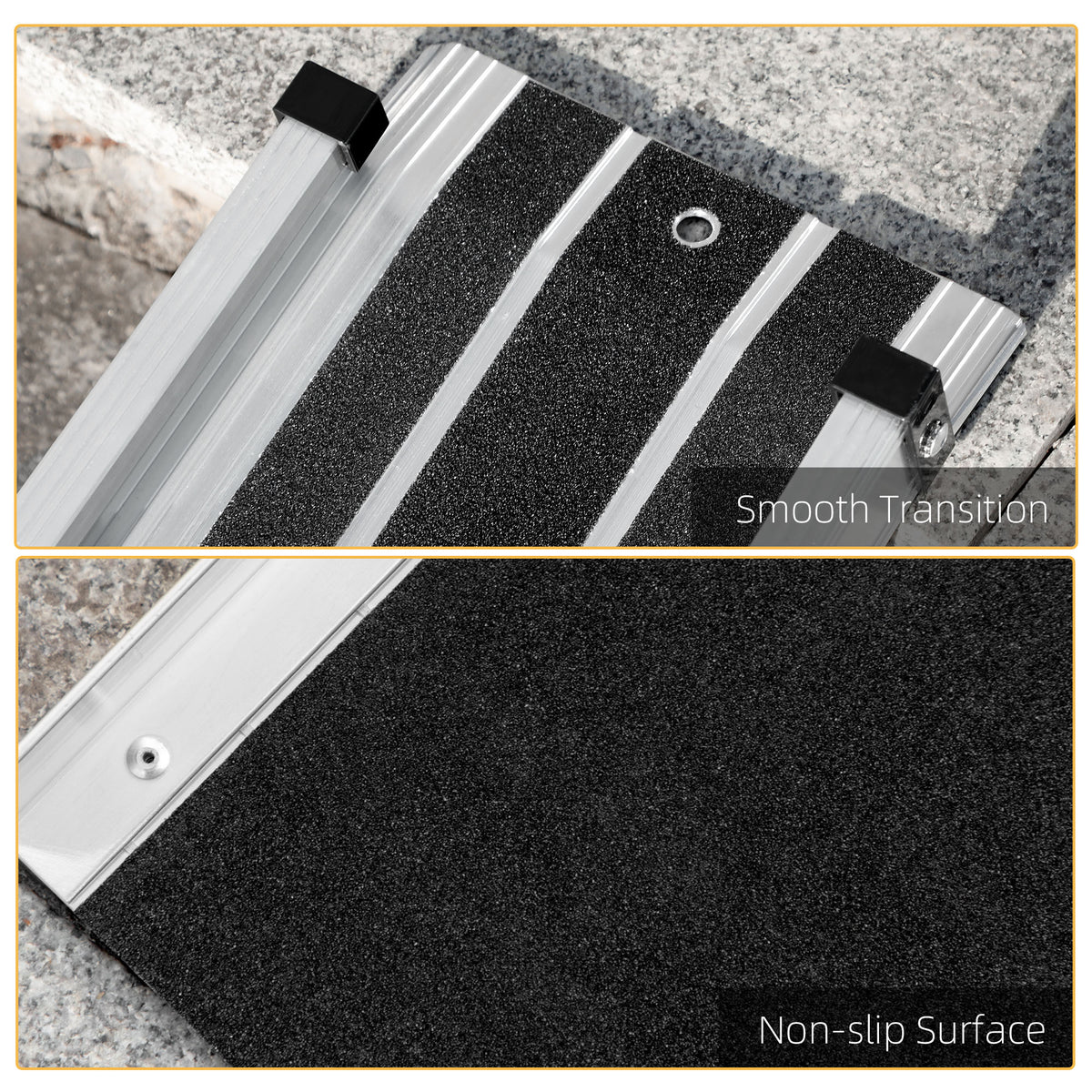 Assistance onto higher surfaces, whenever you need with this HOMCOM set of two portable wheelchair ramps for mobility scooters. Both extend to three different lengths: 75cm, 100cm and 122cm, allowing you to raise to higher levels as required; the lock keeps the length safely in place. Made from aluminium, both pieces are tough and supportive; finished with safe anti-slip mats and guardrails so wheels don't fall off the edges.