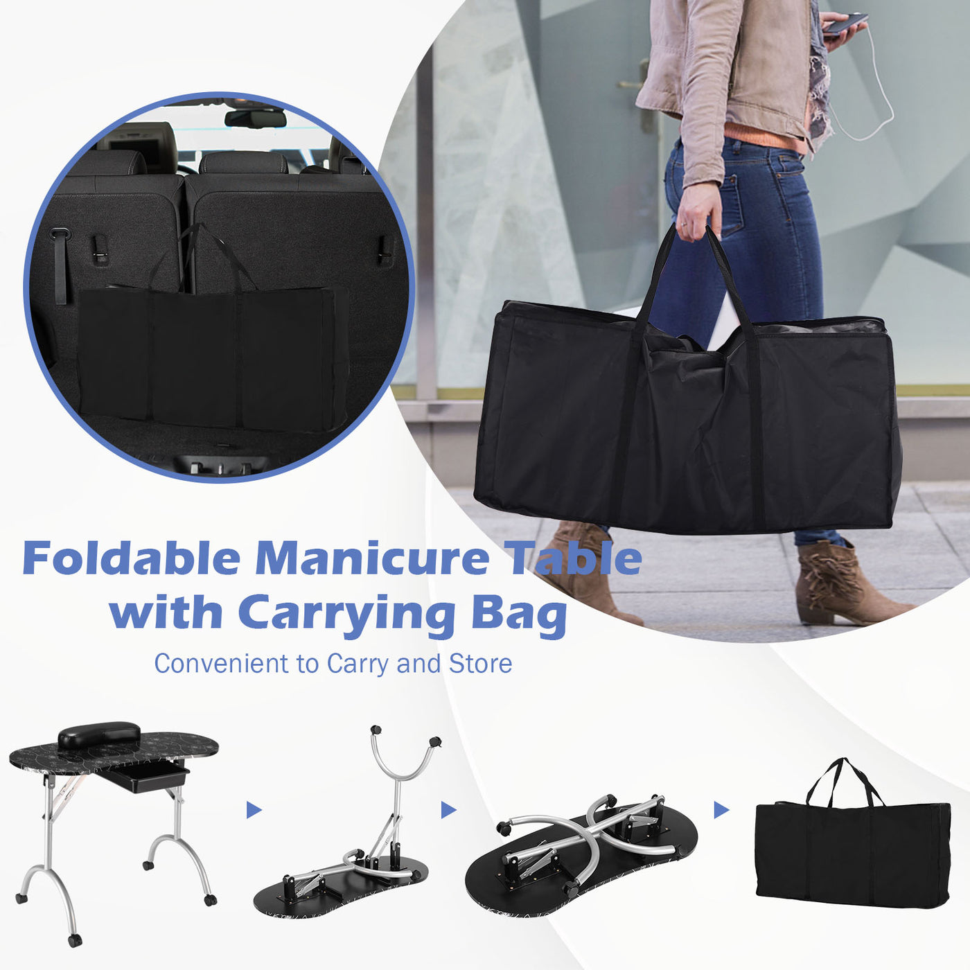 Its spacious desktop has black/white elegant patterns and it equipped with a large capacity drawer and a comfortable wrist pillow. The arc design conforms to ergonomics and brings you a comfortable experience. It is equipped with four PVC lockable rolling wheels, which is convenient for movement and stop. This table is designed for easy movement and increasing your work efficiency. A waterproof Oxford bag is presented for easy carrying and storage. It's perfect for beauty salons, barber salons and home. Buy it now! Portable Foldable Design: Unlike the traditional nail table, thisnail table has good flexibility. It ingeniously adopts foldable design, so that its use site is no longer limited and can be carried easily. At the same time, the folded structure is small in size, easy to store and does not waste space. It equipped with waterproof oxford bags. Four Lockable Wheels: PVC black wheels are rugged and long lasting. At the same time, the lockable device is installed to facilitate the movement and make it stationary. Whether in the studio or at home, the wheels are free and flexible, which can save your effort and increase your work efficiency. Professional Accessories andErgonomics: This nail table is equipped with a detachable and comfortable wristband. There is a large drawer under the spacious tabletop to keep the accessories in order. It is very ergonomic and has a curved tabletop design that gives you a cozy angle. At the same time, the round table corner is safer and avoids scratches. High Quality andStrong Structure: This nail table is made of high quality MDF board and iron tube. And the surface of the iron pipe is silver sprayed paint, which effectively prevents rusting and keeps it new. Use solid triangle and mechanism support to improve the stability of the table and avoid shaking. Elegant Appearance andNo Assembly: The spacious workbench is black/white color background with silver flower pattern, which is beautifully designed and understated. The table is one-piece and does not require assembly, eliminating the hassle of installation and saving you time and effort. This nail table is your best choice.