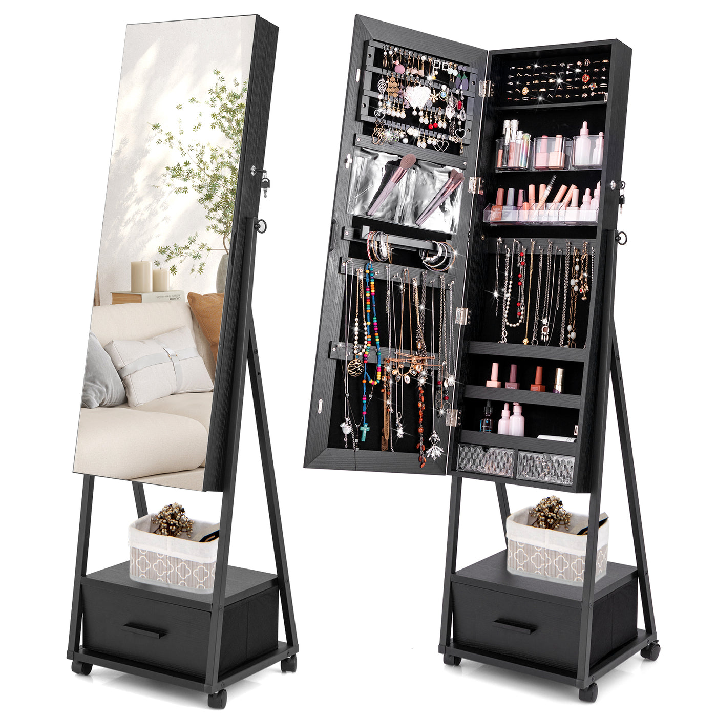 The inside space of the jewellery cabinet features lots of slots, compartments, hooks, drawers and pockets for various sizes of jewellery and makeup. Also, the jewellery cabinet is designed with a full-length mirror, which is convenient for you to dress up and put on makeup. The cabinet door is lockable and 2 keys are included in the package. The movement is effortless with the 4 lockable universal wheels. Made of premium MDF material and iron frame, the stability and durability of this standing jewellery cabinet are assured. Following the instructions, the assembly is easy. If you are looking for such a product, don't hesitate to place an order! 3-in-1 Functional Jewelry Cabinet: This freestanding organizer combines a frameless full-length mirror, storage drawer, jewellery cabinet in one, maximising space utilization. Also, the full-length and high-definition mirror is full screen to present a broader view from head to toe. Large Storage Space with Classification: This mirrored jewellery armoire features 72 earring slots, 24 earring holes, 36 hooks, 2 storage bags, 65 ring slots, 10 compartments for lipsticks, 2 drawers and 3 storage shelves. In addition, there is a drawer at the bottom for other accessories. This jewellery cabinet will perfectly meet your collecting demands. Lockable Wheels and Cabinet Door: This floor-standing mirror jewellery cabinet is equipped with 4 lockable universal wheels, which provide effortless movement from room to room and keep the jewellery unit standing firmly on the ground. Besides, the cabinet door is built with a lock and 2 keys are included for private storage. Stable and Durable Construction: Made of high-quality MDF material and a sturdy iron frame, the mobile makeup armoire is able to offer long-lasting service. Also, the premium hinges ensure smooth opening and closing. And the magnetic door stopper can shut the door firmly even without locking the door. Meanwhile, velvet liner is inside to prevent your jewellery from being scuffed and scratched. Easy Assembly and Wide Application: The assembly is easy and quick with detailed instruction. With simple and elegant appearance, the jewellery organizer will fit in easily with your furniture and be an attractive decoration to your room. The rolling jewellery cabinet is suitable for various scenarios such as bedrooms, entryways and locker rooms. A good gift for every woman and girl!