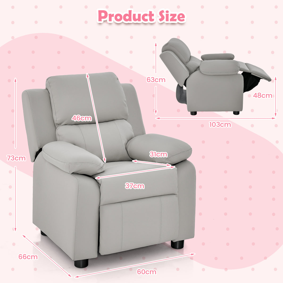 This kids recliner chair is an ideal gift for your children. It has 1 adjustable backrest, 2 comfy armrests and 1 retractable footrest, which is perfect for gaming, reading or sleeping. Besides, the PU leather surface and sponge padded seat also add more seating comfort. And the hidden storage space under the armrest is ideal for placing kids' snacks or toys. Solid wood frame and anti-slip foot pads ensure overall sturdiness. If you are looking for a kids recliner chair like this, do not hesitate to place an order! Unique Reclining Backrest: With flexible pushback mechanism, the backrest can be reclined from 120° to 144° to meet kid's different needs of reading books, watching TV or sleeping. Meanwhile, the footrest will fully extend to offer extra comfort in the recliner mode. Flip-Up Armrests with Storage: This kids recliner chair also features 2 functional flip-up armrests to hold your arms and provide added storage. Kids can open the armrests and place their toys or snacks under the armrest, which brings them much convenience. Comfortable Kids Sofa Chair: The whole sofa chair is covered with waterproof PU leather, ensuring skin-friendly touch and easy maintenance. The seat is filled with premium sponge, while the back and arms are padded with soft PP cotton. Kids will feel comfortable when sitting or lying on the sofa. Safe and Sturdy Construction: Solid wood frame makes it durable and strong enough to serve active children for a long time. The kids sofa bears a weight up to 50 kg, Moreover, 4 non-slip foot pads help our sofa stay steady on the ground. Easy Assembly and Product Size: This padded sofa chair comes with step-by-step instruction and complete accessories, so that you can conveniently finish assembly. Product dimension: 66 x 60 x 73 cm(L x W x H). Lying dimension: 103 x 60 x 63 cm (L x W x H).