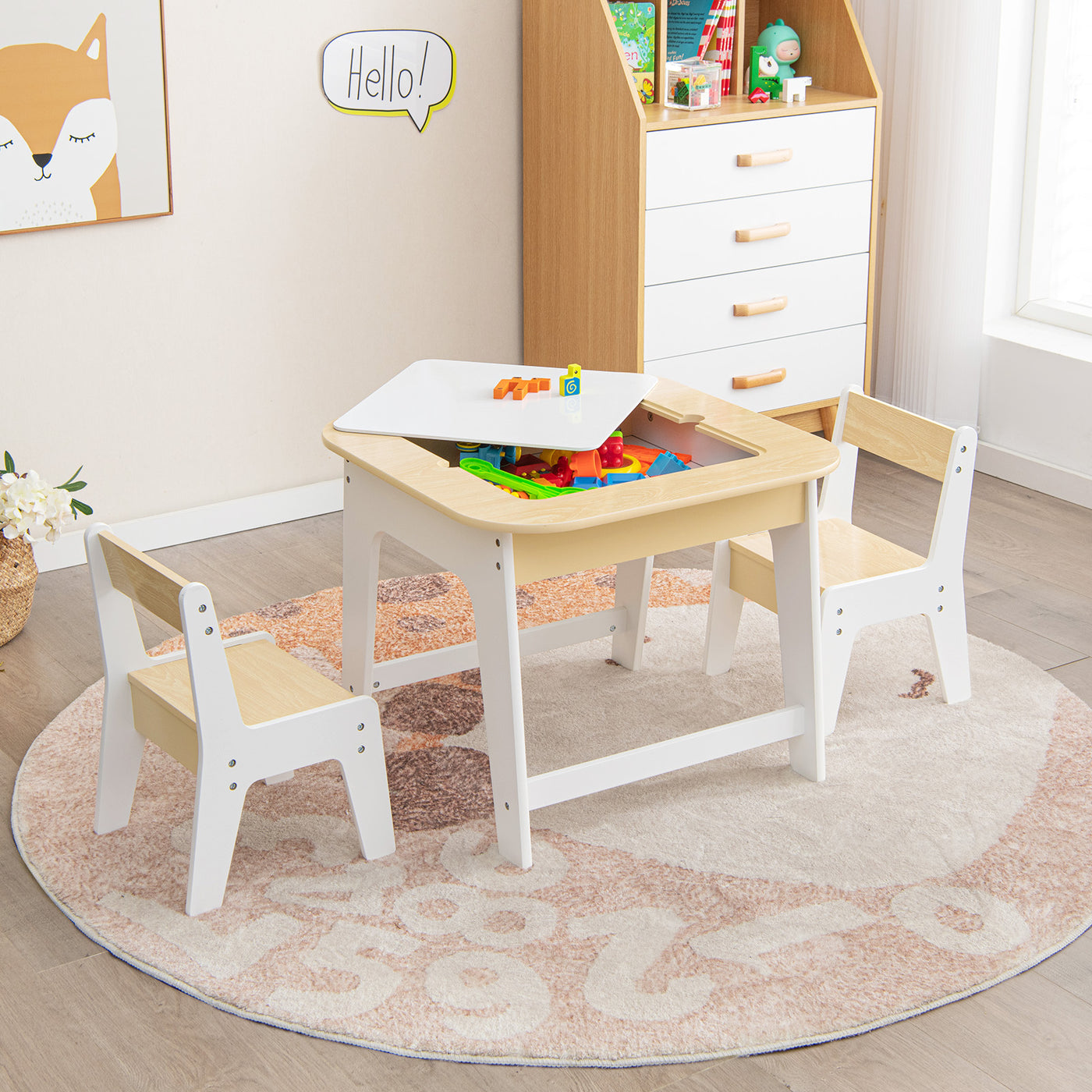 This table and chairs set offers 3-6 years old kids a wonderful place to read, play, study, write or eat. Its double-sided tabletop has a whiteboard and blackboard for children to draw with their friends. Plus, the hidden storage space also helps kids to build a good habit of sorting out. When toddlers feel tired, they can rest on our ergonomic chairs. After use, you can store these chairs under the table. Plus, our table and chair set has passed ASTM and CPSIA certifications, which is safe and durable enough for kids to use. The smooth painted surface is easy to clean, saving you time and energy. Fun Double-Sided Tabletop: The activity table is designed with a double-sided tabletop: one side is a blackboard, while the other is a whiteboard. Thus, your little one can freely draw on its surface to let their imagination run wild. Plus, the kid's table also serves as a dining table, reading table or writing table. Large Hidden Storage Space: There is a hidden storage space under the tabletop, which helps kids to better organize their items and avoid missing items. Toddlers can effortlessly remove the tabletop to store their toys, blocks, snacks, books and stationeries. 2 Comfortable Toddler Chairs: 2 kid's chairs are designed with ergonomic backrests and wide seats to provide toddlers with a comfortable sitting experience. Kids won't feel uncomfortable even after a long sitting. Besides, the round corners and burr-free edges prevent accidental bumping or scratching. Safe and Child-friendly Materials: Certified by EN71 certifications, our table and 2-chair set is safe enough for 3-6 years old kids to use. Apart from that, high-quality MDF materials make the children's writing table set strong and durable enough to serve your kids for a long time. Space-saving Design and Easy Assembly: When not in use, these chairs can be stored under the table or stacked on the table to save limited space. Thanks to numbered accessories and detailed instructions, you can assemble in just a few minutes.