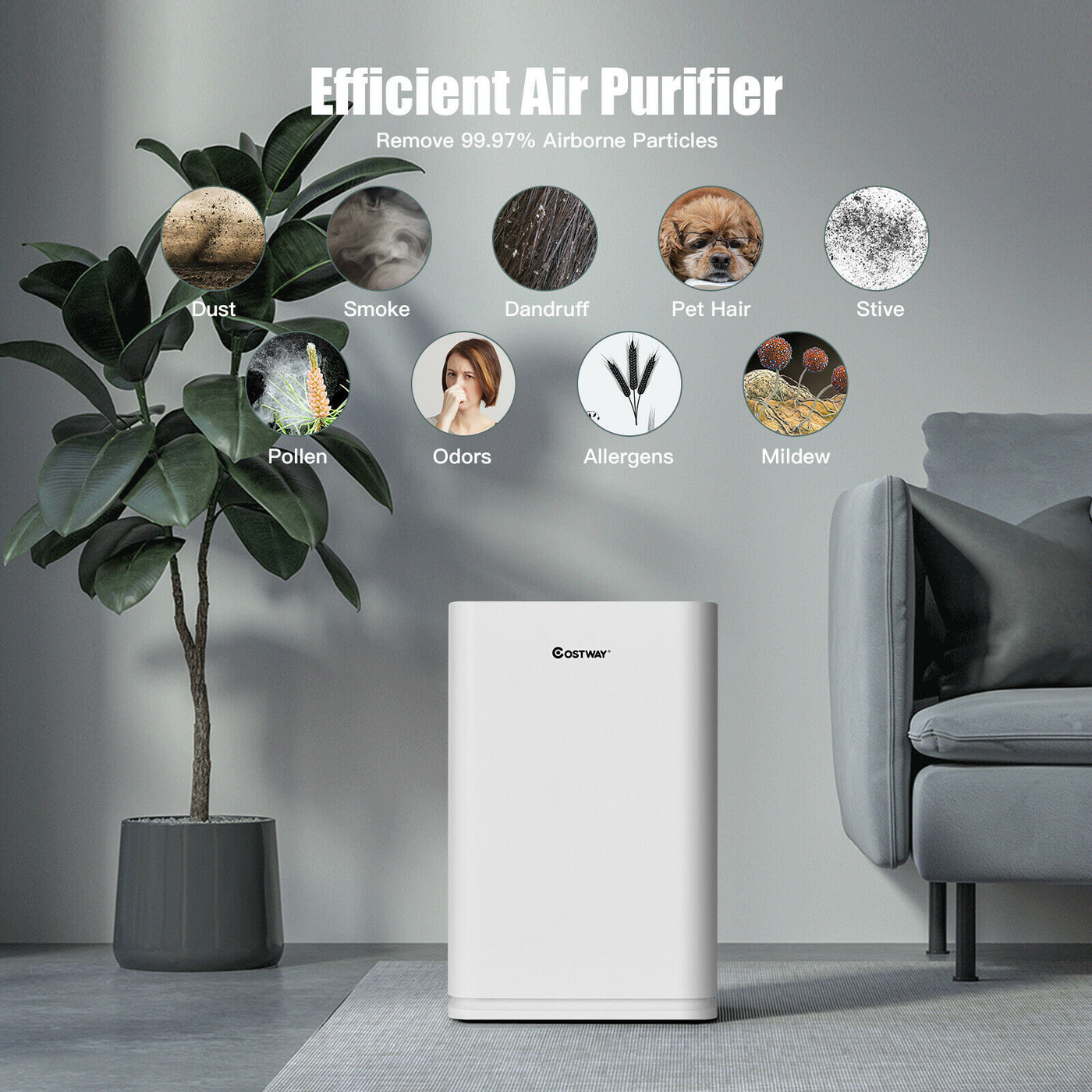 This air purifier is ideal for home and office. This will be a perfect gift for your family and friends. Has the dirty air affected your normal life? Do you want to have an air purifier? This air purifier is featured with 3 filter nets that will efficiently release fresh air and provide a healthy breathing environment for you and your family. It only consumes little energy but the coverage area can be up to 36 square meters. And the purifier can remove smoke, bacteria, viruses, allergens, pet dander and cooking odours from the air. In addition, the child-lock design will prevent changes to the existing model. This air purifier comes with 4 fan speeds and auto mode. With the touch button, you can choose from low, medium, and high speed or the auto mode to run the air purifier easily. This air purifier will satisfy your different purification needs. Don't hesitate to order it now! Set the time with the range of 0-8 hours Cover up to 36 square meters of purifier area CE certification ensures the safety of air purifier Child-lock design to prevent a change of the mode Compact size is suitable to be placed in small spaces To eliminate smoke, germs, bacteria, viruses and so on HEPA and activated carbon filter for effective air purification Sleeping mode with low noise would not disturb your sleeping Air quality indicator shows different colour according to air quality Auto mode can adjust speed settings according to real-time air quality