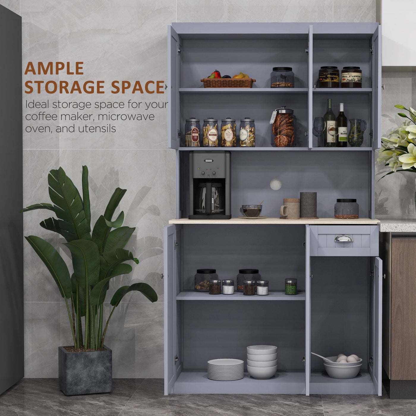 HOMCOM 180cm Freestanding Kitchen Cabinet, Modern Storage Cupboard with Open Countertop, Drawer and 6 Doors, Grey - White