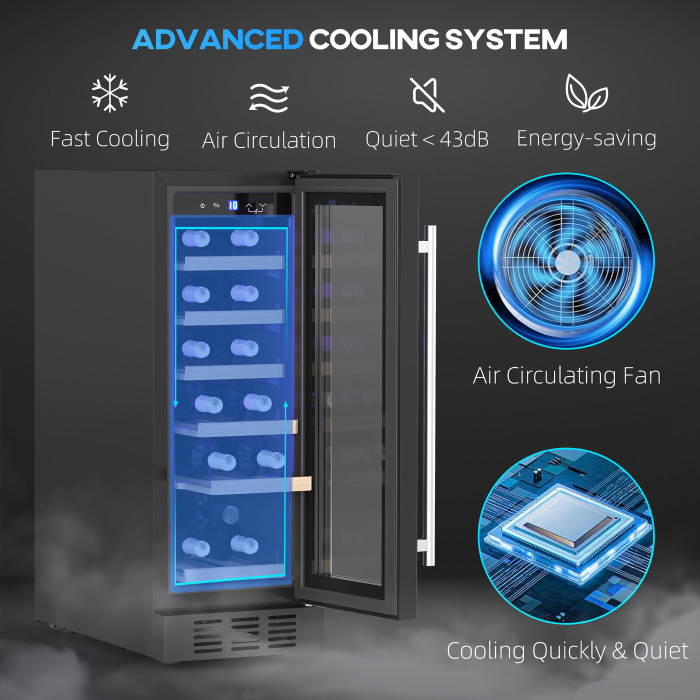 Chill your cherished bottles to perfection in this HOMCOM wine fridge. Six full-length, and beautiful, wooden racks hold 19 bottles; also adjustable to fit larger bottles when needed. Adjust the temperature between 5-18°C to find the coolness best for you. Complete with a double glass door, which is also resistant to damaging UV rays.