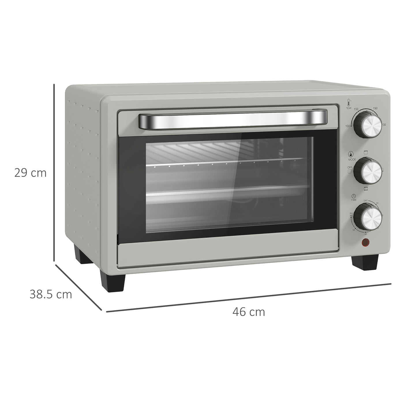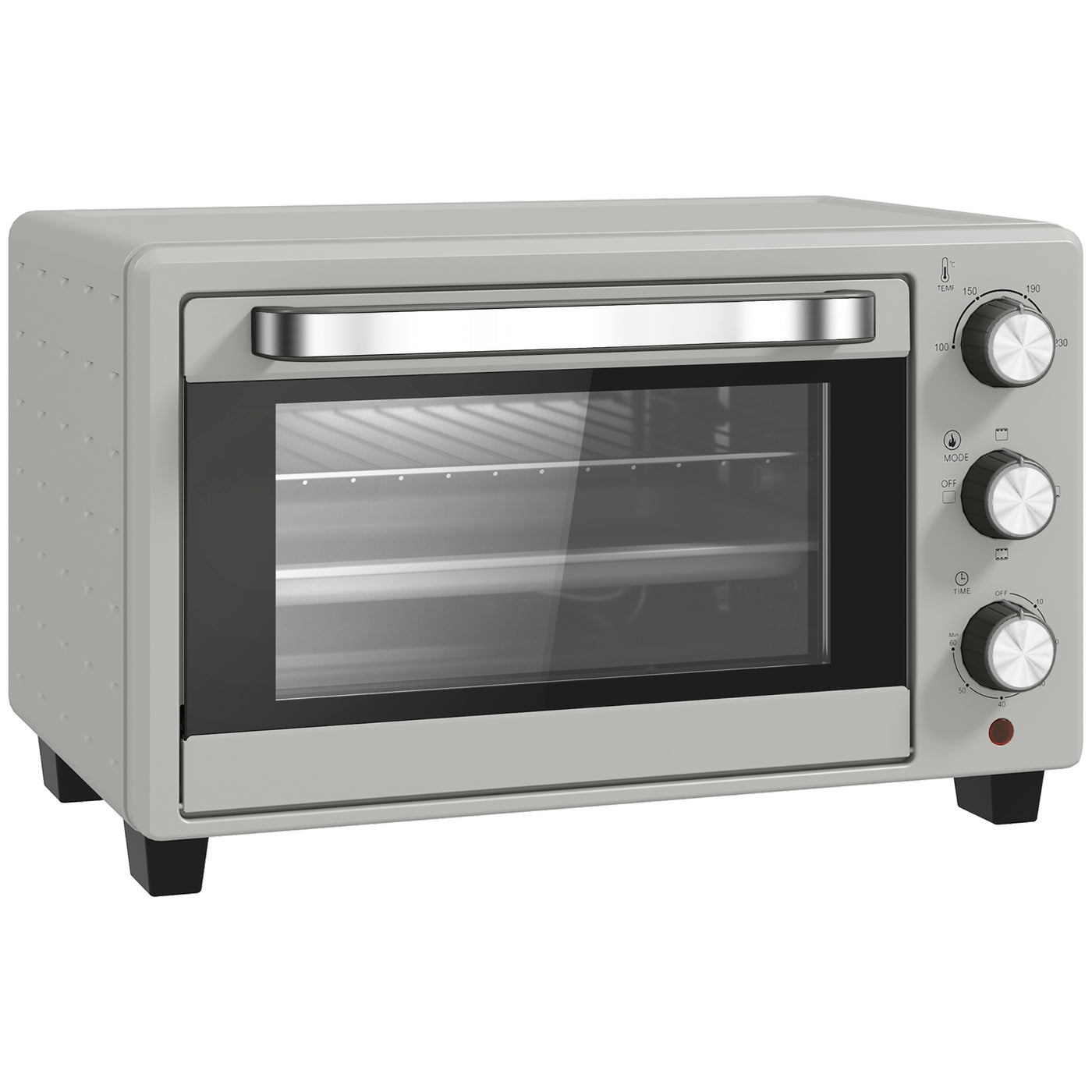 Whatever the space or size, it's easy to cook a wide variety of food with this HOMCOM 21L countertop oven. Comes with a removable wire rack and cooking tray, with three different holding levels to reposition easily. The heat range, between 100°C and 230°C, means you can cook at different temps - no unneeded burnt food! the 0-60 minutes timer means it will switch off when you need it to, without being in the same room. Comes complete with tray handle, so you don't have to touch hot metal.