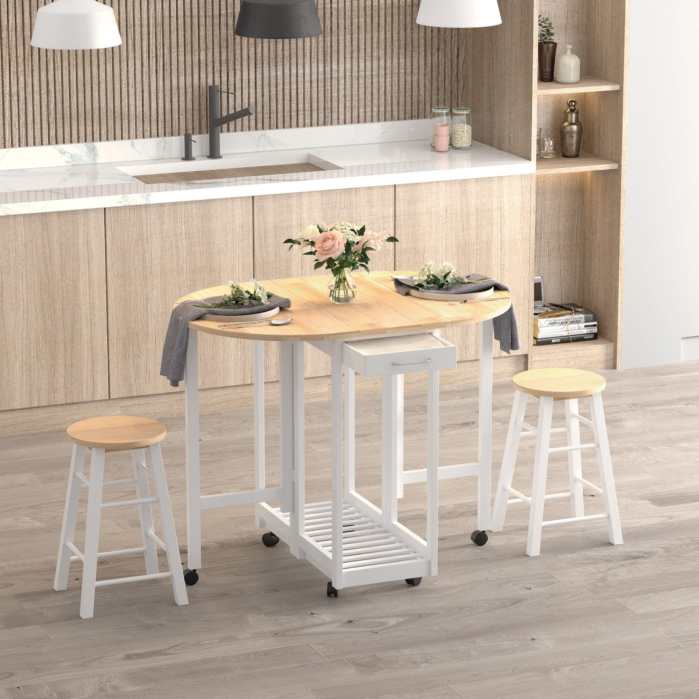 HOMCOM 3 Pieces Dining Room Set, Mobile Foldable Dining Table and 2 Stools with Storage Shelf, 2 Drawers and 6 Wheels, Drop Leaf Bar Table and Stools for Home Kitchen Pub, White - White