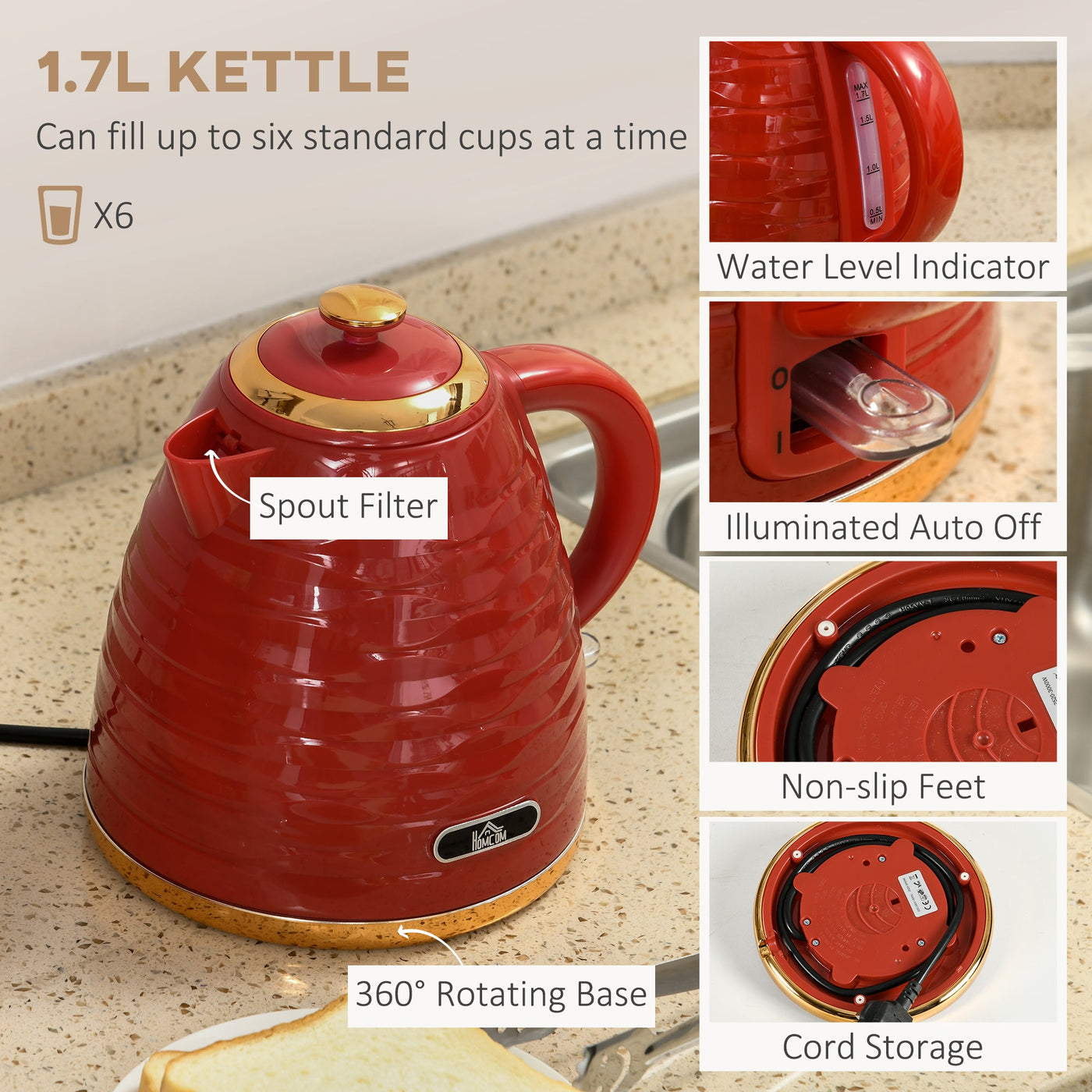 HOMCOM 3000W 1.7L Rapid Boil Kettle & 4 Slice Toaster, Kettle and Toaster Set with 7 Browning Controls and Crumb Tray, Red - Red