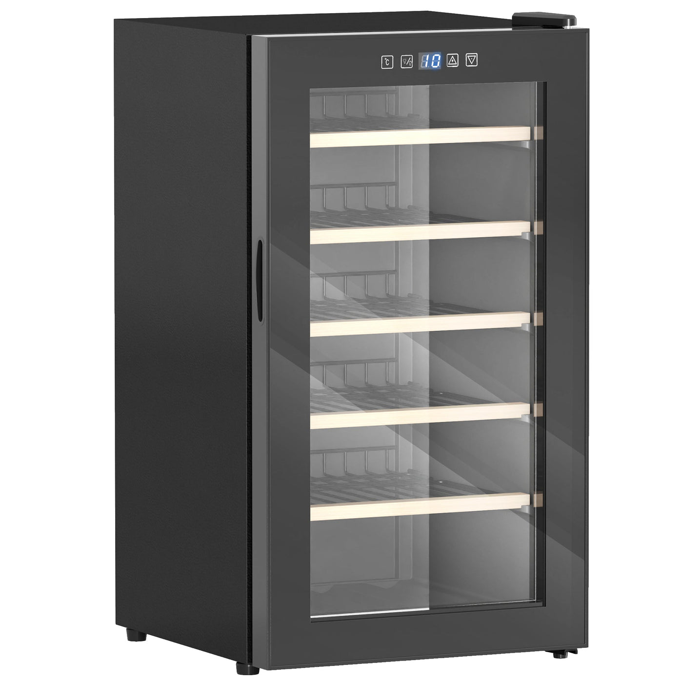 Chill your favourite tipples to perfection with the HOMCOM Wine Fridge with glass door. Precision temperature control from 5-20℃ lets you cater to whites, prosecco. A simple touch control and LED display ensure hassle-free operation, while the large capacity holds up to 41 bottles on stylish wood finish racks. Great for any spot from home bars to kitchens!