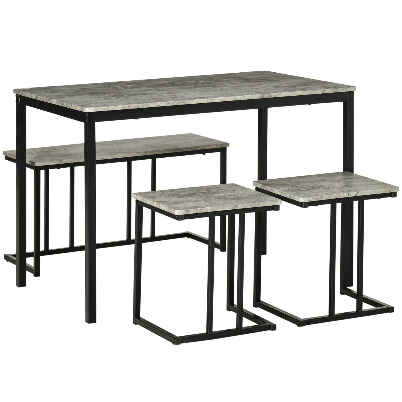 HOMCOM Dining Table and Chairs Set for 4 People, Concrete Effect Kitchen Table and Bench Set with Steel Frame, 4 Piece Dining Room Sets, Grey - Grey