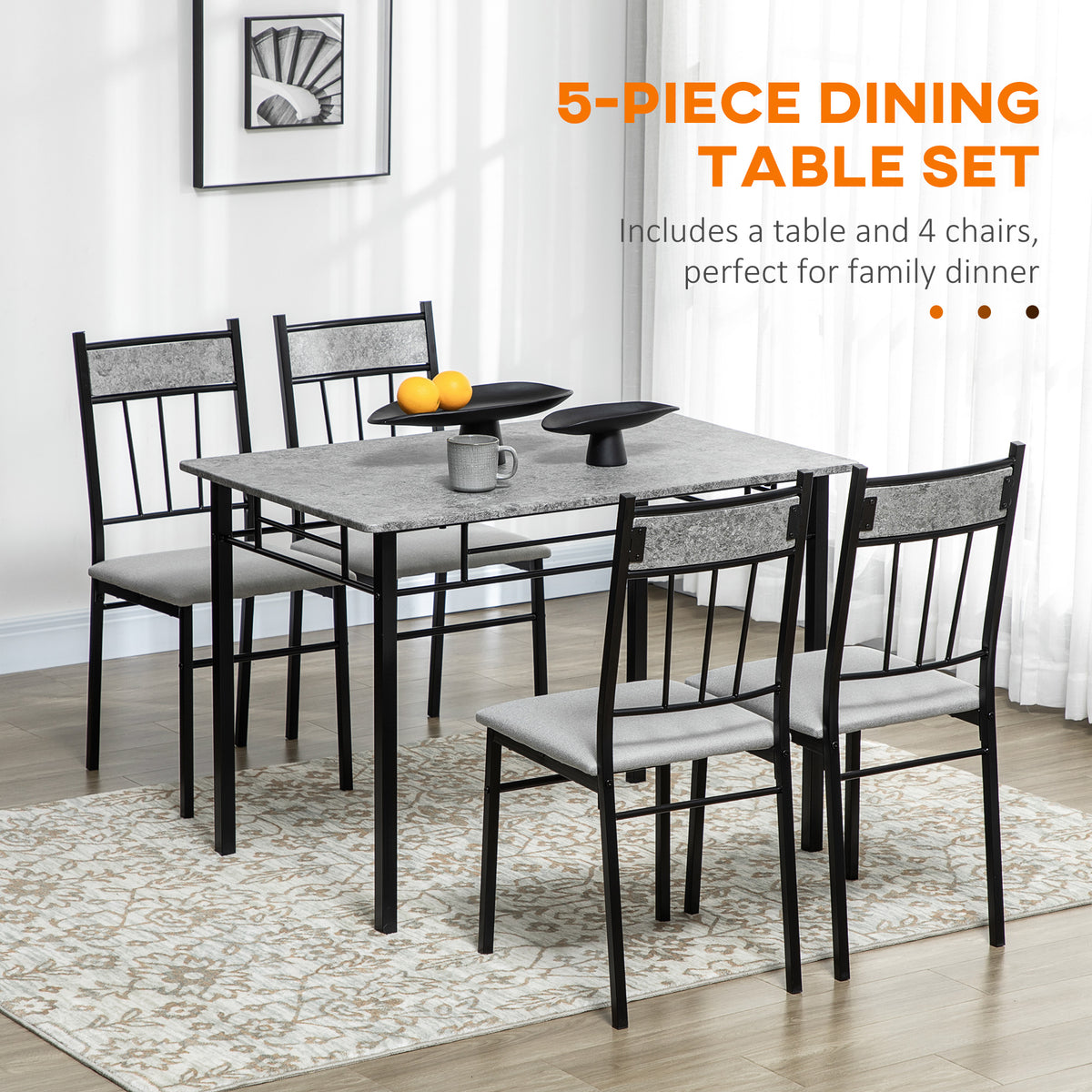 HOMCOM Five-Piece Marble Effect Dining Table Set - Grey/Black