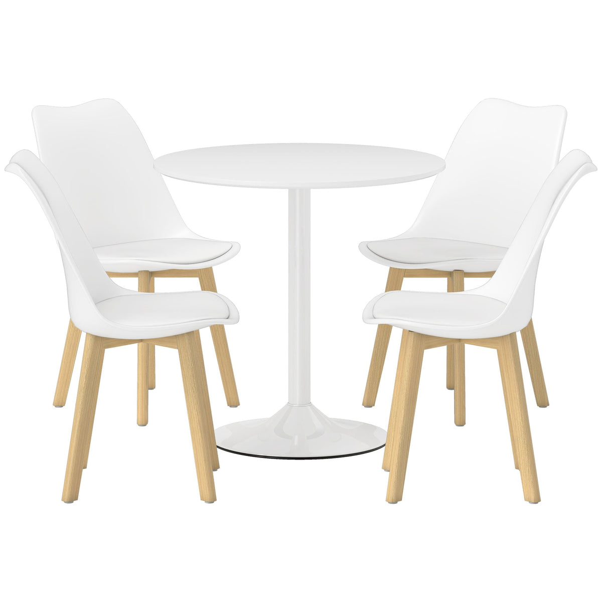 A sleek and modern centrepiece, with this HOMCOM dining set. Comes with a round table and four dining chairs - room for all the family, morning and night. All pieces are made from stable plastic, with wooden legs on the chairs for strong support; the pedestal base on the table allows plenty of leg room.