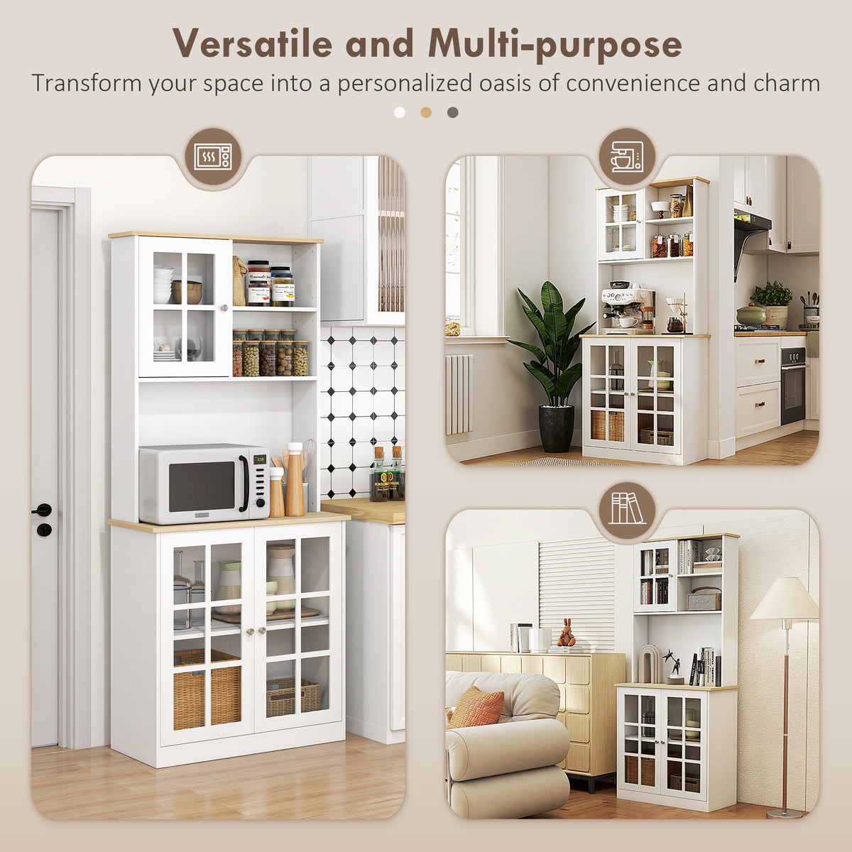 HOMCOM Freestanding Kitchen Cupboard, Storage Cabinet with Doors and Adjustable Shelves, Counter Top, Grid Glass Doors, 80L x 37W x 183H cm - White - White