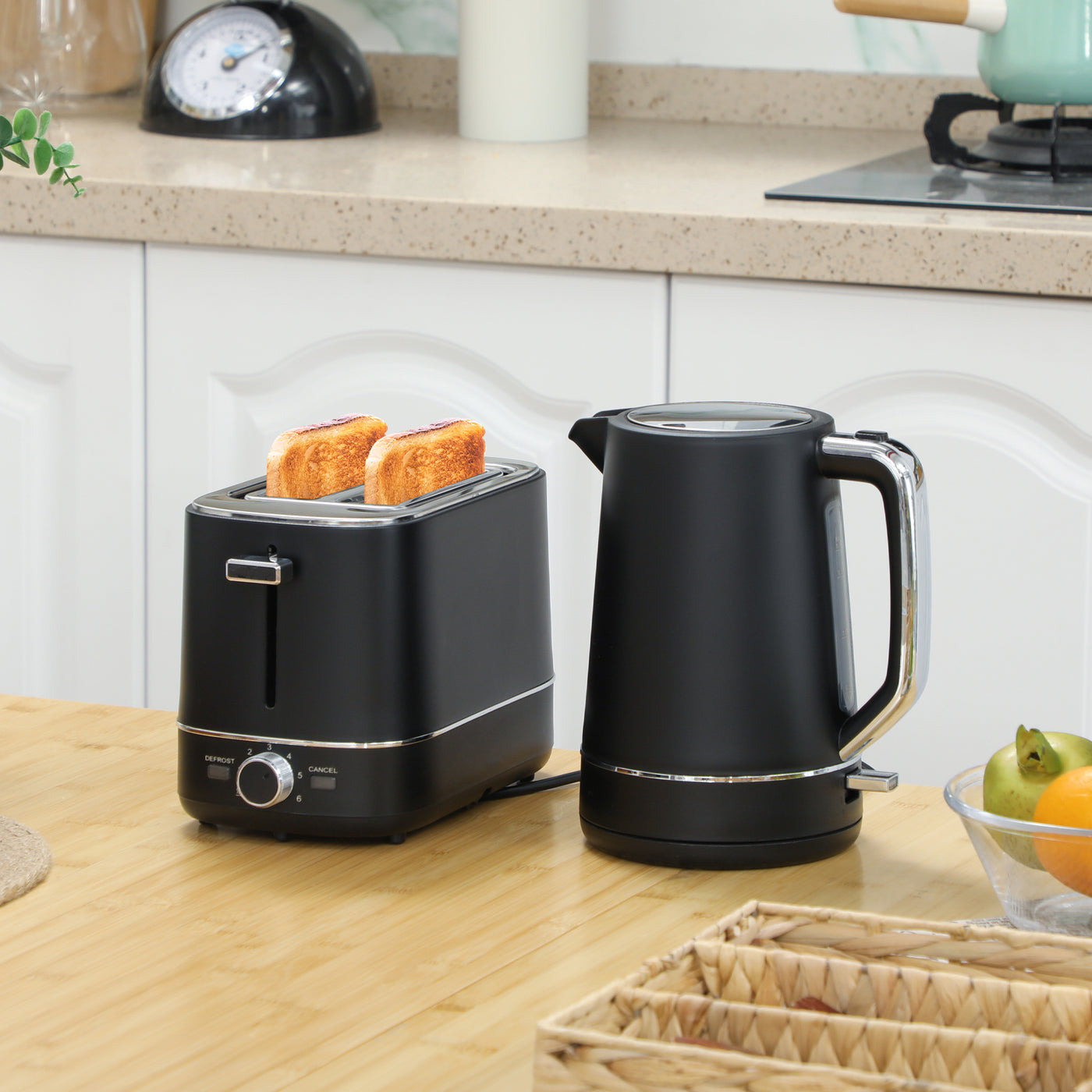 Elevate your morning routine with the HOMCOM Black Kettle and Toaster Set. This chic, modern duo includes a Fast Boil Kettle that zips to a boil in just three minutes and a versatile two slice toaster with reheat, defrost and cancle functions. Finished in sleek finish, this set not only looks smart but makes your breakfast quick and effortless. Enjoy the simplicity and efficiency of streamlined design!