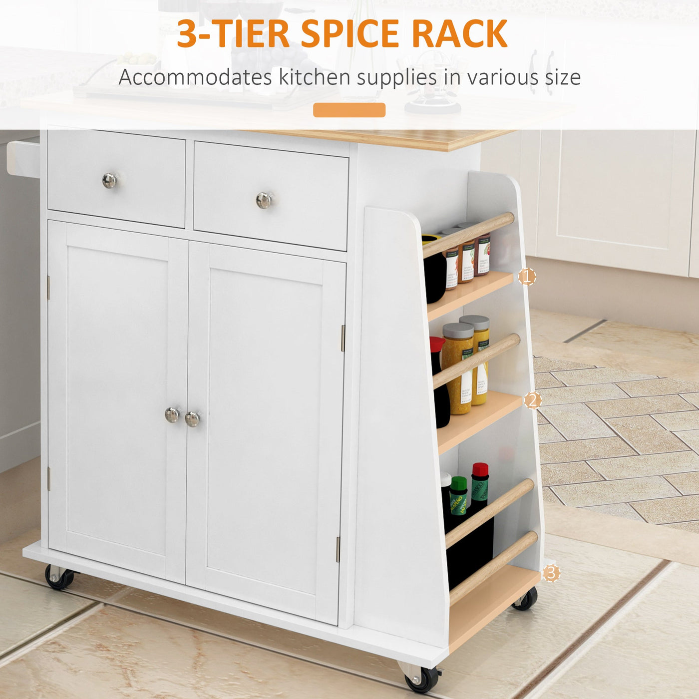 HOMCOM Kitchen Island on Wheels, Mobile Storage Trolley, Rolling Kitchen Cart with Rubber Wood Top, 2-Door Cabinets, 2 Drawers, Adjustable Shelf, 3-Tier Spice Rack, Drawers - White