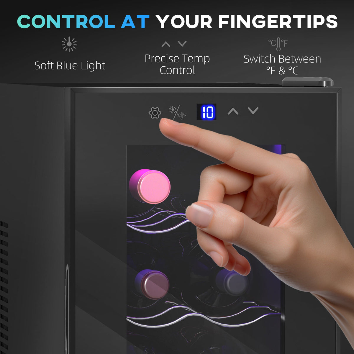 HOMCOM Mini Table Top Wine Fridge, 8 Bottle, 17L, 8-18℃, 26.5cm Quiet Under Counter Wine Cooler Fridge with Glass Door, LED Light, Digital Touch Screen, Temperature Control - Black