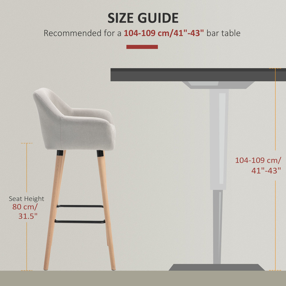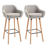 Let modern elegance take the forefront in your home seating, thanks to this set of two bar stools from HOMCOM. Linen upholstery is stylish and allows the skin to breathe naturally. Solid wood legs for full support, with lower footrests to elevate the lower body. Tub shaped seats add to the style, with a padded seat for comfort. Mid-rise backs offer a touch of support when you lean back. Comes in a set of two for a matching dining area look.