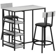 Compact dining, for you and company with this HOMCOM three-piece dining set. Comes with a bar table and two bar chairs; the table is fitted with three shelves to provide easy-reach space for tableware and more. When done, you can tuck the chairs into the table to save space.