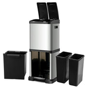Keep your kitchen clean and tidy with this stainless steel Recycling Pedal bin.Help separate your recyclables from your general waste with this 32l 3 compartment pedal bin. The outside has been treated not only to be easy to clean, but is dust-proof, water-proof and finger-proof. The three removable inner liners can be efficiently used to sort rubbish into recyclable, food waste and general waste. The top 2 bins open via a small button, while the larger bottom compartment uses a pedal. All 3 compartments have a handle for ease of emptying. If you are looking for such product, don't hesitate to purchase now! Premium stainless steel surface is dust-proof and anti-fingerprint Three inner buckets of two sizes better for waste separation High quality PP inner liners with handles for ease of emptying Separate buttons and pedal control the pedal bin Space saving, lightweight design Keep the lid open and free your hands for easy use Non-slip seal bottom is stable Sealed ABS lid locks in odours No assemble require