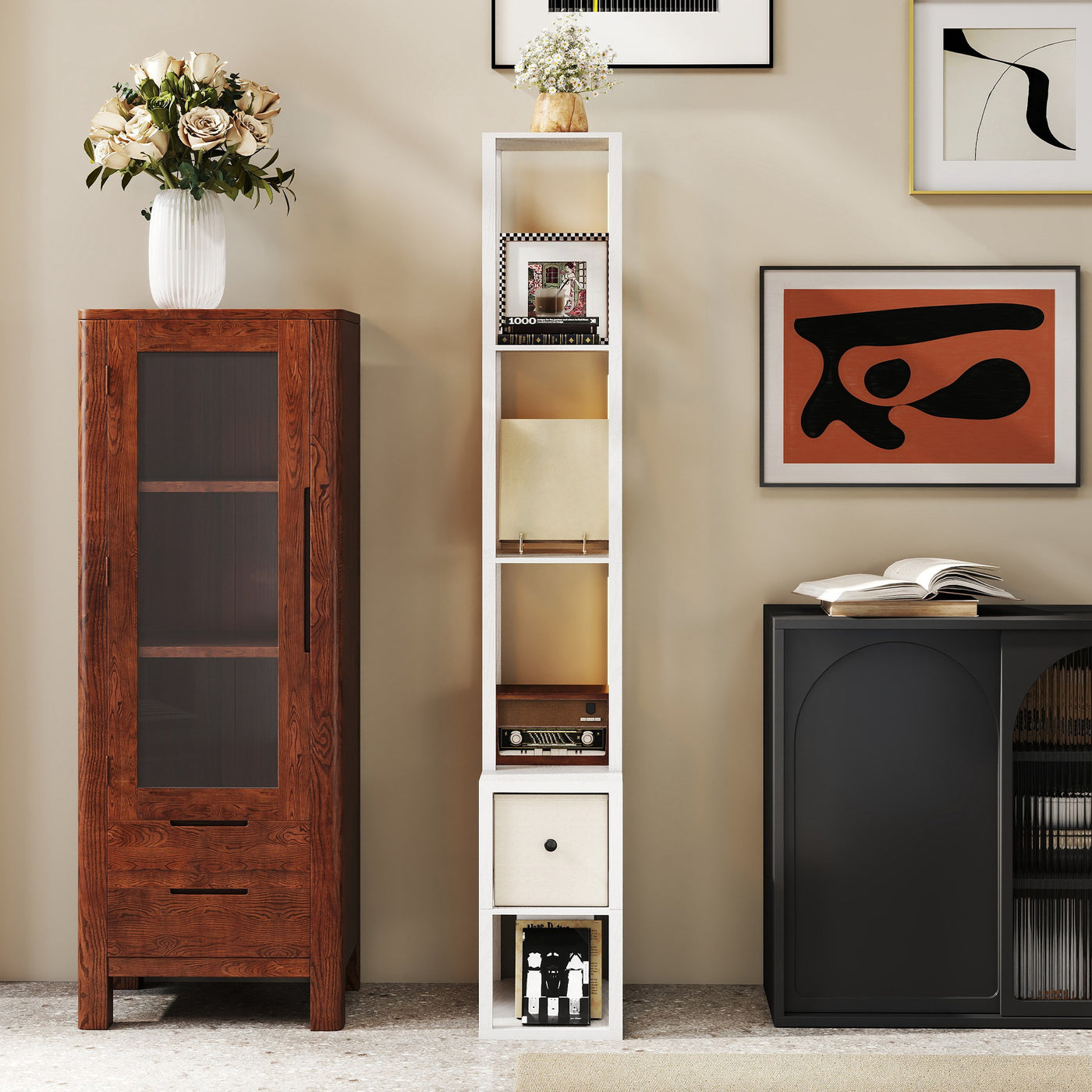 HOMCOM Floor Lamp with Shelves, LED Column Modern Standing Lamp with Fabric Drawer, Adjustable Brightness, Foot Switch for Living Room, Bedroom, Office, White - White