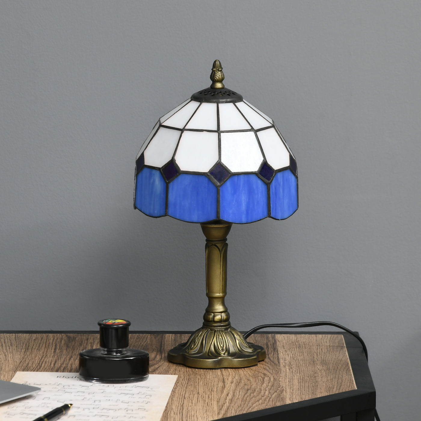 HOMCOM Handmade Stained Glass Table Lamp, Antique Bedside Lamp for Bedroom, Living room, Home, Nightstand, Decorative Night Light, Blue - Blue