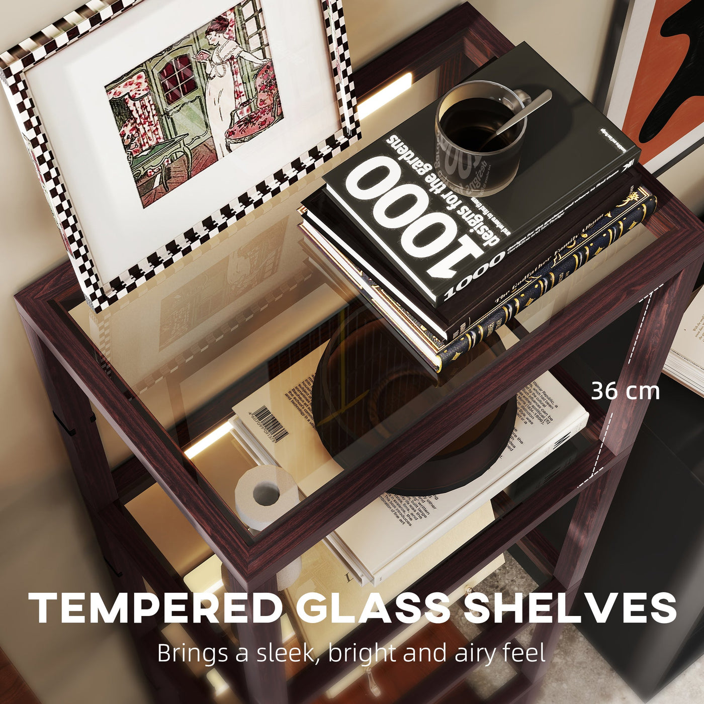A dash of light for the warm ambience - simply pop this HOMCOM LED floor lamp with shelves into your chosen corner to start enjoying the beautiful illumination. This tall lamp is fitted with warm white LED light lines: 3000 K with three-level adjustable brightness. This bedroom lamp serves as a shelving unit with four-section storage to keep your favourite pieces on show. Tempered glass shelves add a sleek touch and help light transmission. Plug in and step on the foot switch to start enjoying.