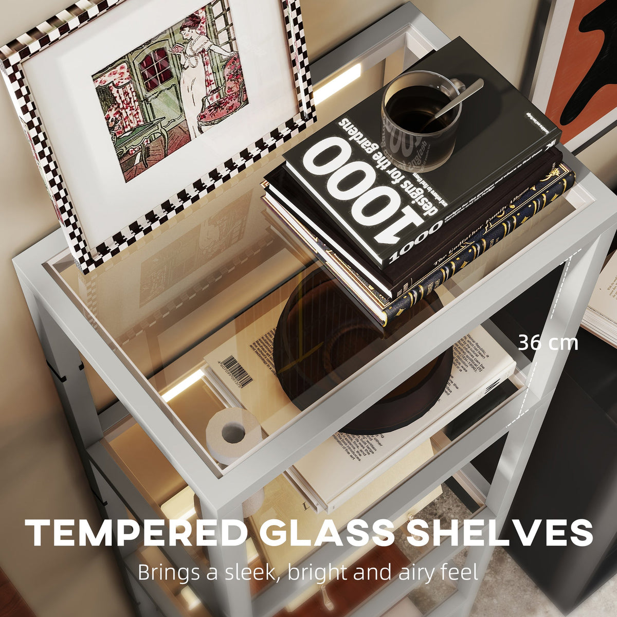A dash of light for the warm ambience - simply pop this HOMCOM LED floor lamp with shelves into your chosen corner to start enjoying the beautiful illumination. This tall lamp is fitted with warm white LED light lines: 3000 K with three-level adjustable brightness. This bedroom lamp serves as a shelving unit with four-section storage to keep your favourite pieces on show. Tempered glass shelves add a sleek touch and help light transmission. Plug in and step on the foot switch to start enjoying.