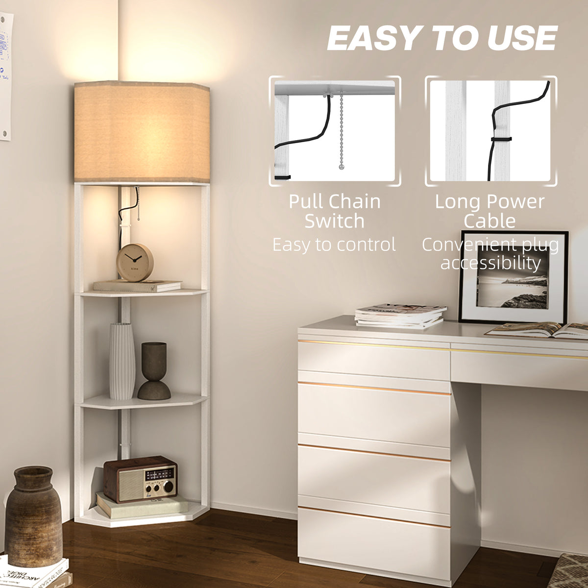 2-in-1 for the home: this shelf floor lamp, from HOMCOM. Combines three shelves and top light - in a triangle design to neatly slot into corners. The top light is easy to operate - pull the chain to turn on/off. Its fabric shade omits a soft glow for a welcoming atmosphere. Three shelves give you plenty of storage room. Now you just need to decide where to put it...