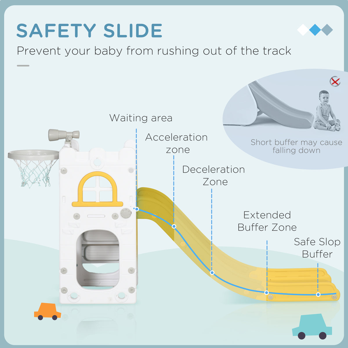 Create a playtime phenomenon with the AIYAPLAY kids slide, suitable for ages 1-3 years. Its four-in-one design includes a slide, basketball hoop, telescope and climber, brings endless fun and excitement. Safety features like an acceleration area, deceleration zone and buffer zone, along with closed steps to prevent slips, make it a great choice for indoor play. Suitable for toddlers, it elevates playtime to thrilling new heights.