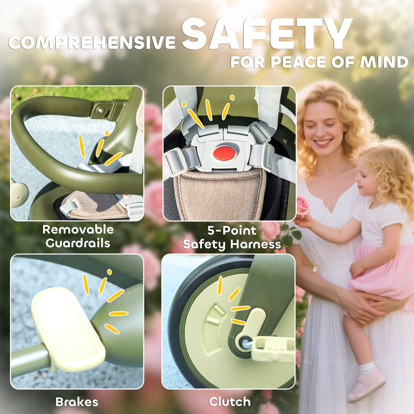 AIYAPLAY 5 in 1 Kids Trike with Adjustable Backrest, Toddler Tricycle with Push Handlebar, Adjustable Backrest, Dark Green - Green