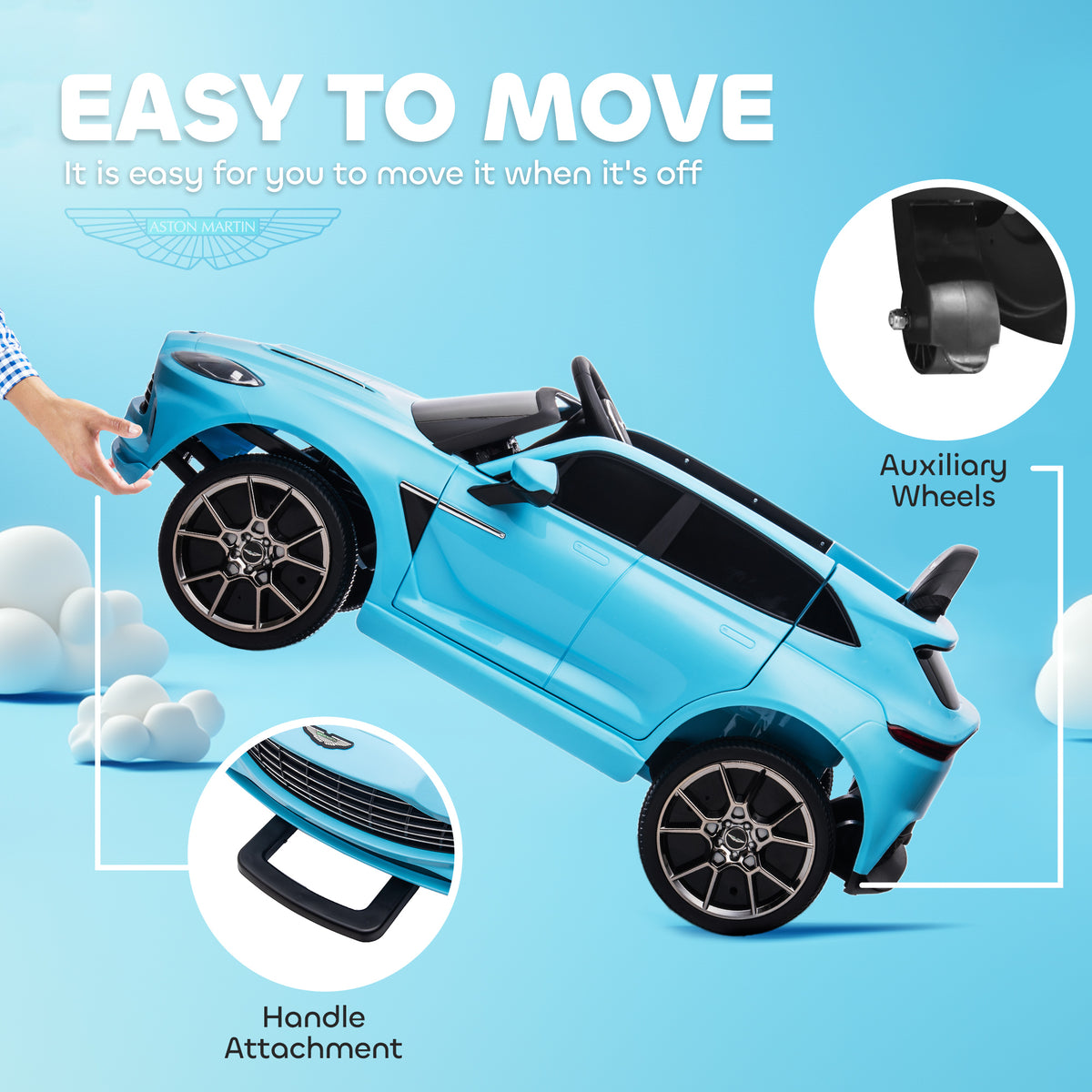 Rev up the fun with the AIYAPLAY 12V Aston Martin DBX licensed ride-on! This stylish electric car offers both remote control for adults and a manual option for kids to steer themselves. With headlights, a horn and music, every ride becomes entertaining. When not in use, simply move it using the handle and auxiliary wheels. Experience thrilling rides, exciting adventure and create everlasting childhood memories with this fantastic ride-on car.