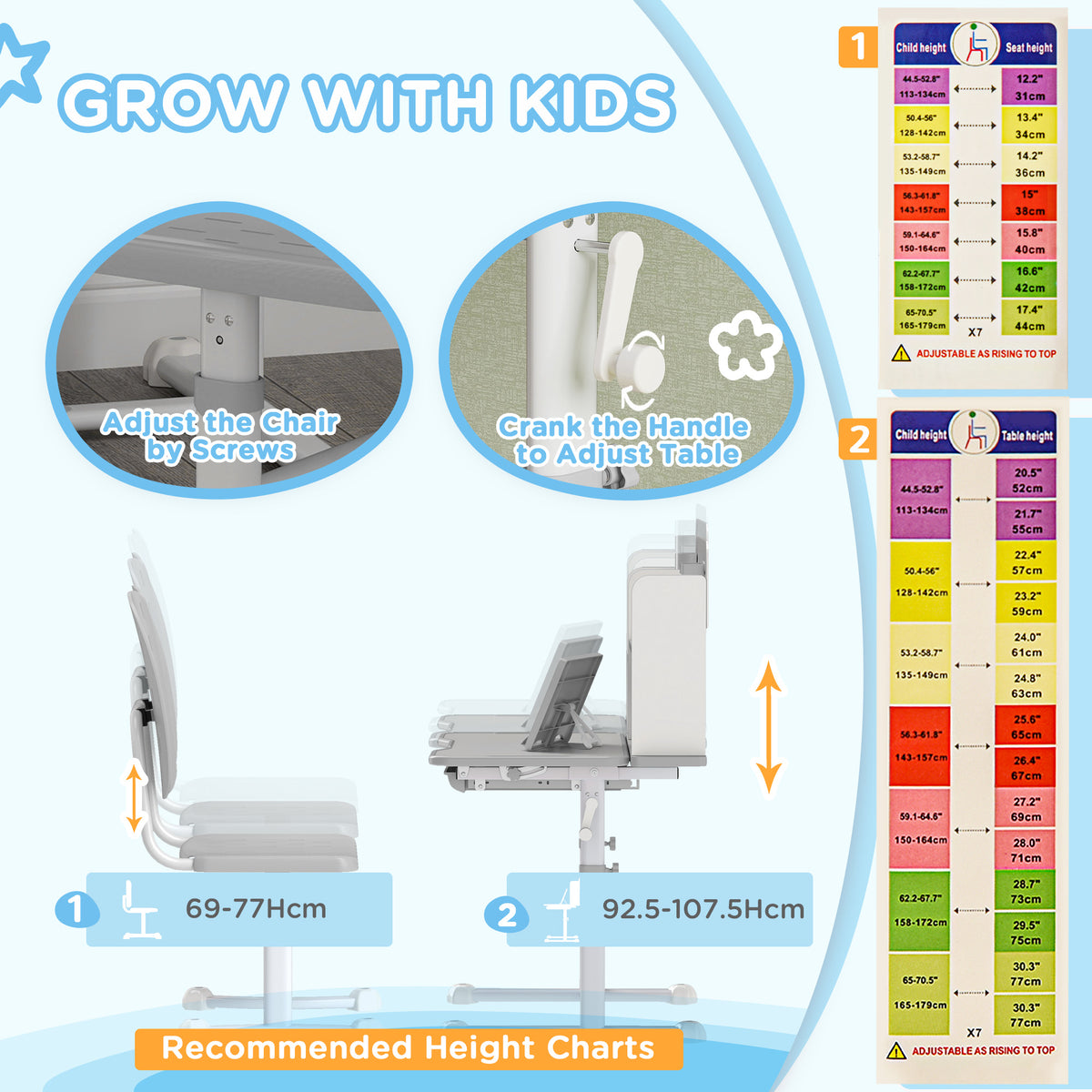AIYAPLAY Height Adjustable Kids Desk and Chair Set, Children School Study Desk with Tiltable Desktop, Reading Rack, Grey - Grey