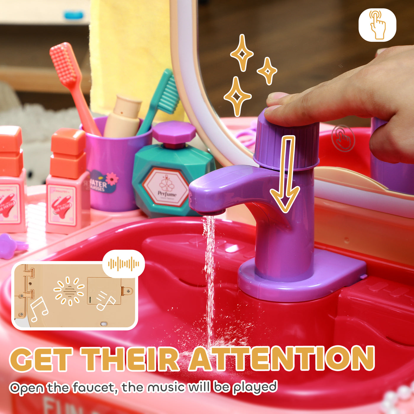 Bring something different to playtime with the AIYAPLAY kids vanity table. Featuring a mirror with magical LED lights and a faucet that plays music and really releases water, this makeup vanity set is great for creative, make-believe games. It also includes a special spot for the towel and hand sanitiser container, promoting good hygiene during play. This compact piece fits perfectly in a corner – let the fun begin!