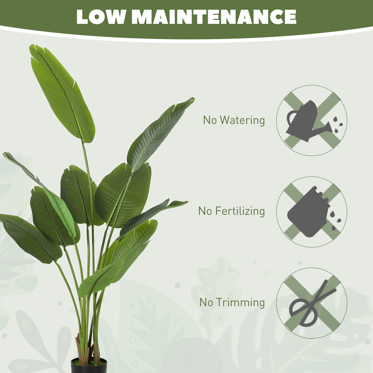 Transform your space with the HOMCOM artificial bird of paradise. Featuring 10 lifelike PEVA leaves and flocked soil, this faux banana plant adds a touch of the tropics to any room. Suitable for those without a green thumb, it requires no watering or pruning and stands sturdily in its weighted pot. Suitable for living rooms or home offices!