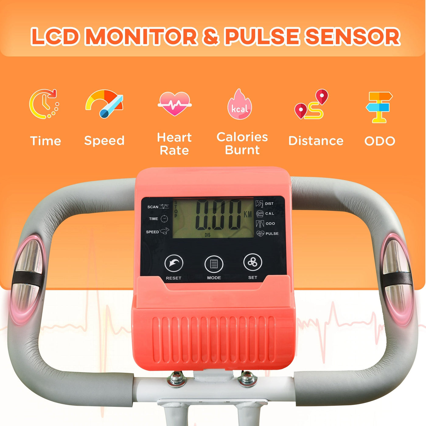 Enjoy a complete cardio workout with the HOMCOM indoor exercise bike. Great for home use, it features an LCD monitor that tracks time, speed, distance, heart rate and calories burned to help you achieve your fitness goals. Use it as an upright or recumbent bike, plus take advantage of the tension ropes to strengthen your biceps. The phone holder keeps your device nearby so you can watch videos, play music and more while you exercise. When you're done, simply fold the bike for easy storage.