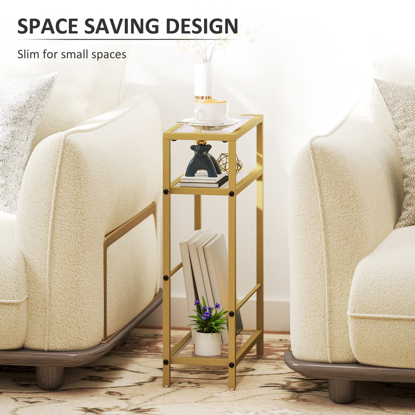 HOMCOM 3-Tier Side Table, Narrow End Table with Storage Shelf and Tempered Glass Tabletop for Small Spaces, Bedroom, Living Room, Entryway, Gold Tone - Gold Tone