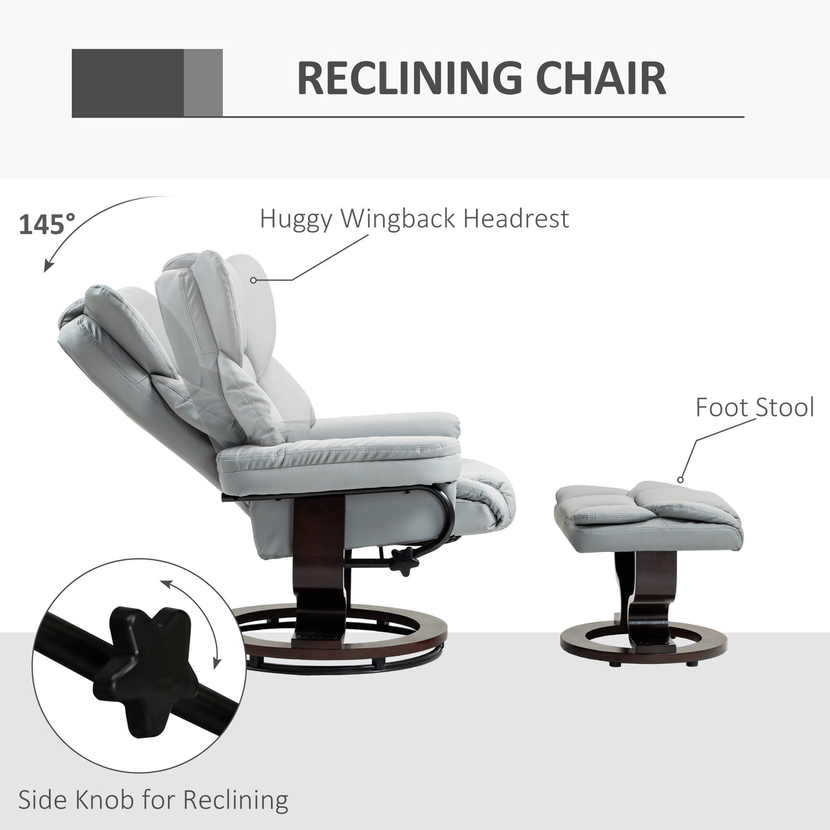 HOMCOM 360° Swivel Recliner Chair with Footstool, PU Leather Manual Recliner Armchair with Solid Wood Base, Upholstered Reclining Chair for Living Room, Bedroom, Office, Light Grey - Light Grey