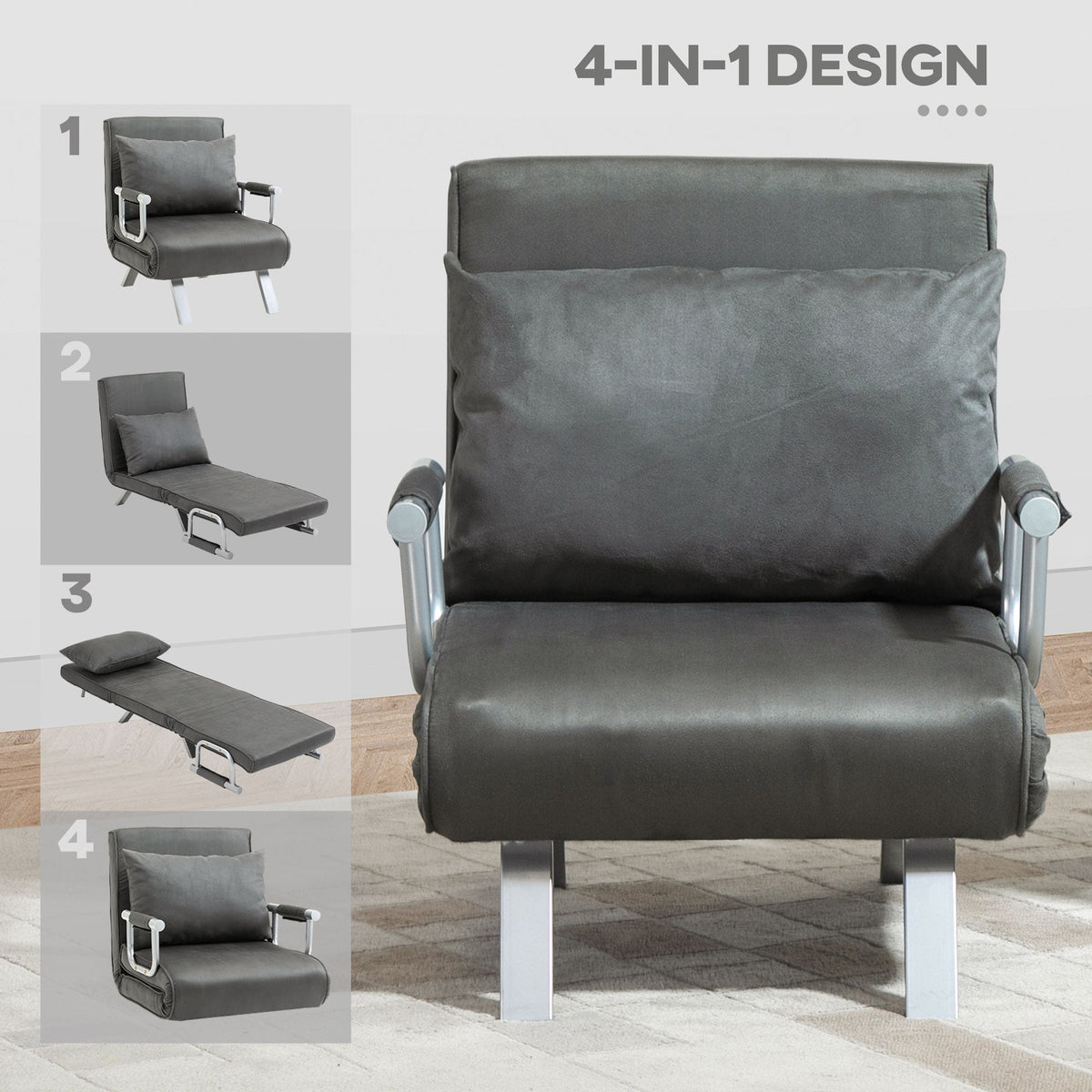 From sitting, to sleeping easily with this HOMCOM single couch bed. The four-in-one transforms from a single armchair to a reclining chair, a floor chair or a comfortable bed - use it how you like. The back sets between five different positions - paired with the inner padding and faux suede upholstery, this is a comfortable and soft piece you'll love using day and night. Comes complete with a pillow for extra comfort and support.