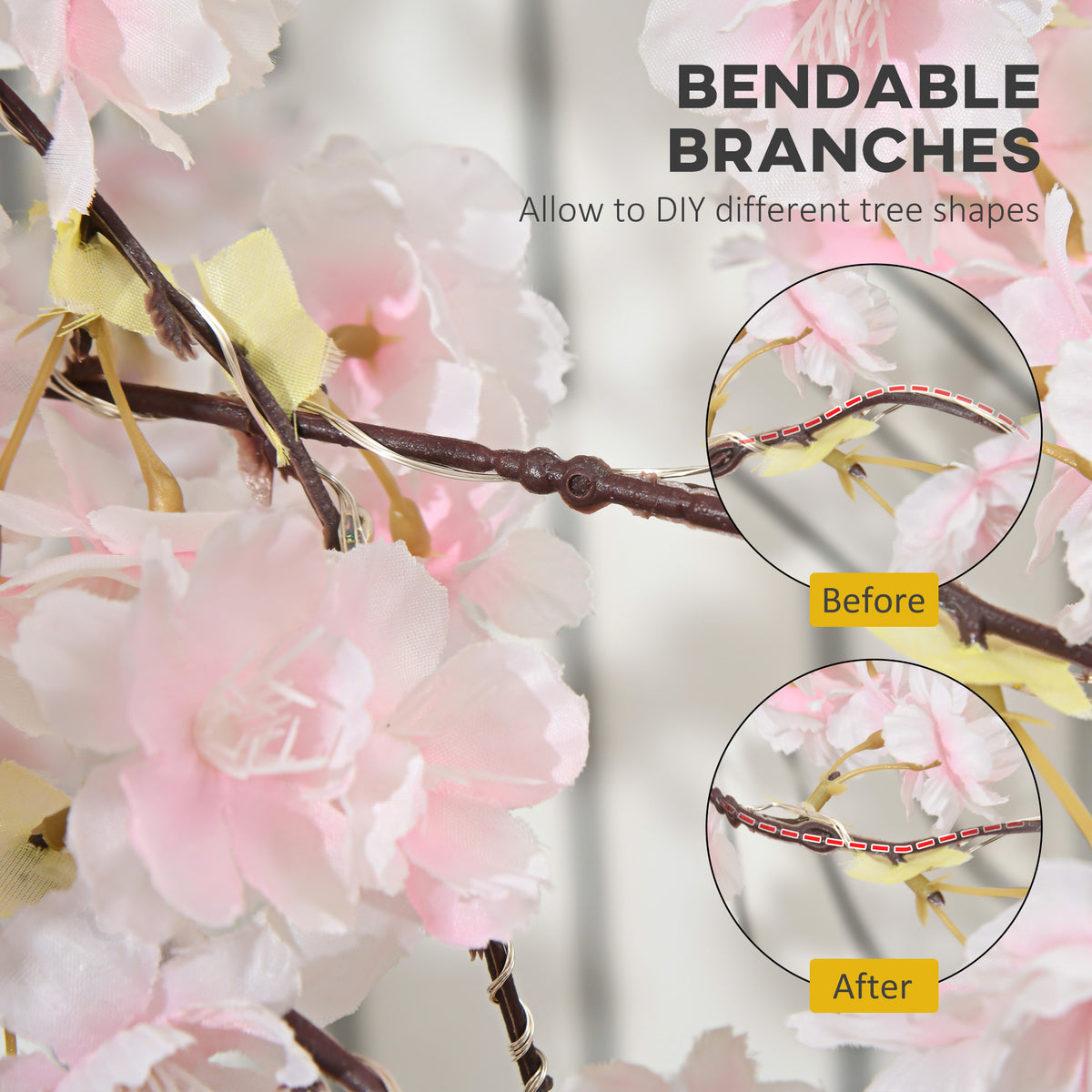 Beauty and light, all through the night. This HOMCOM light-up faux tree is a unique way to dress your outdoors. Formed into a Pink Sakura Tree design, it's fitted with 450 LED lights - this provides plenty of illumination. The flexible branches allow you to bend to a position you require. The plastic body means it's a reliable piece, with a water-resistant coating making it safe for outdoor use. Light up the night in glorious colour.