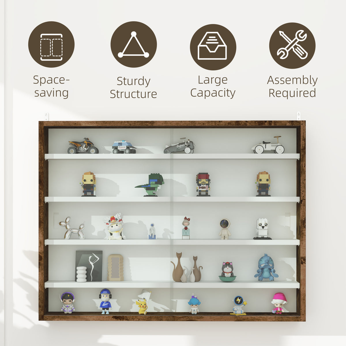 HOMCOM 5-Tier Wall Display Shelf Unit Cabinet w/ 4 Adjustable Shelves Glass Doors Home Office Ornaments 60x80cm Rustic brown - Rustic Brown