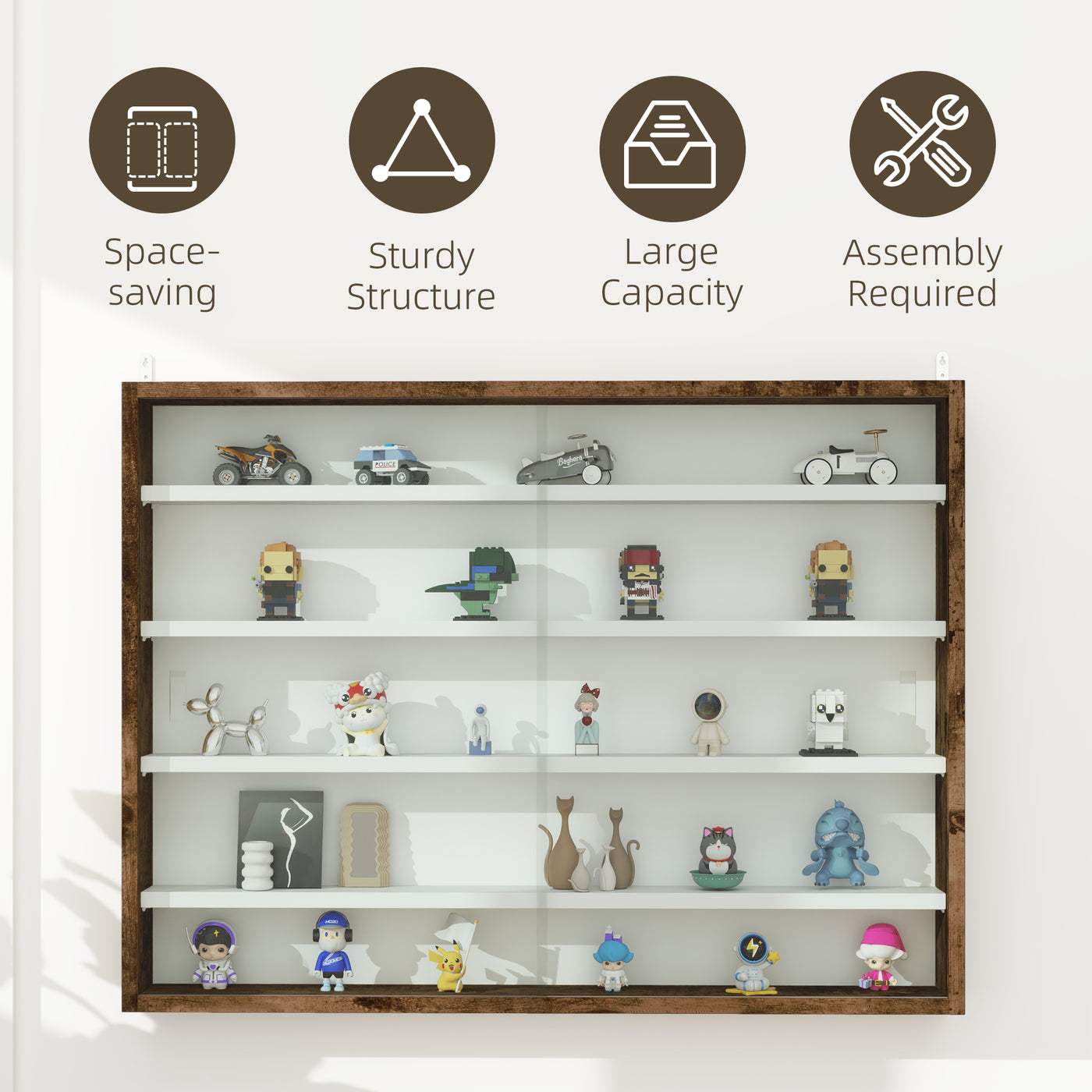 Display and organise favourite decorations with this HOMCOM wall display cabinet. It has four adjustable shelves, with 7 different positions, offering lots of space for smaller and larger items. Made from particle board, the structure is sturdy, and fitted with two sliding glass doors, keeping everything protected and allowing easy access. Easy to fix onto walls, this classic home furnishing will keep all your favourite pieces beautifully displayed.