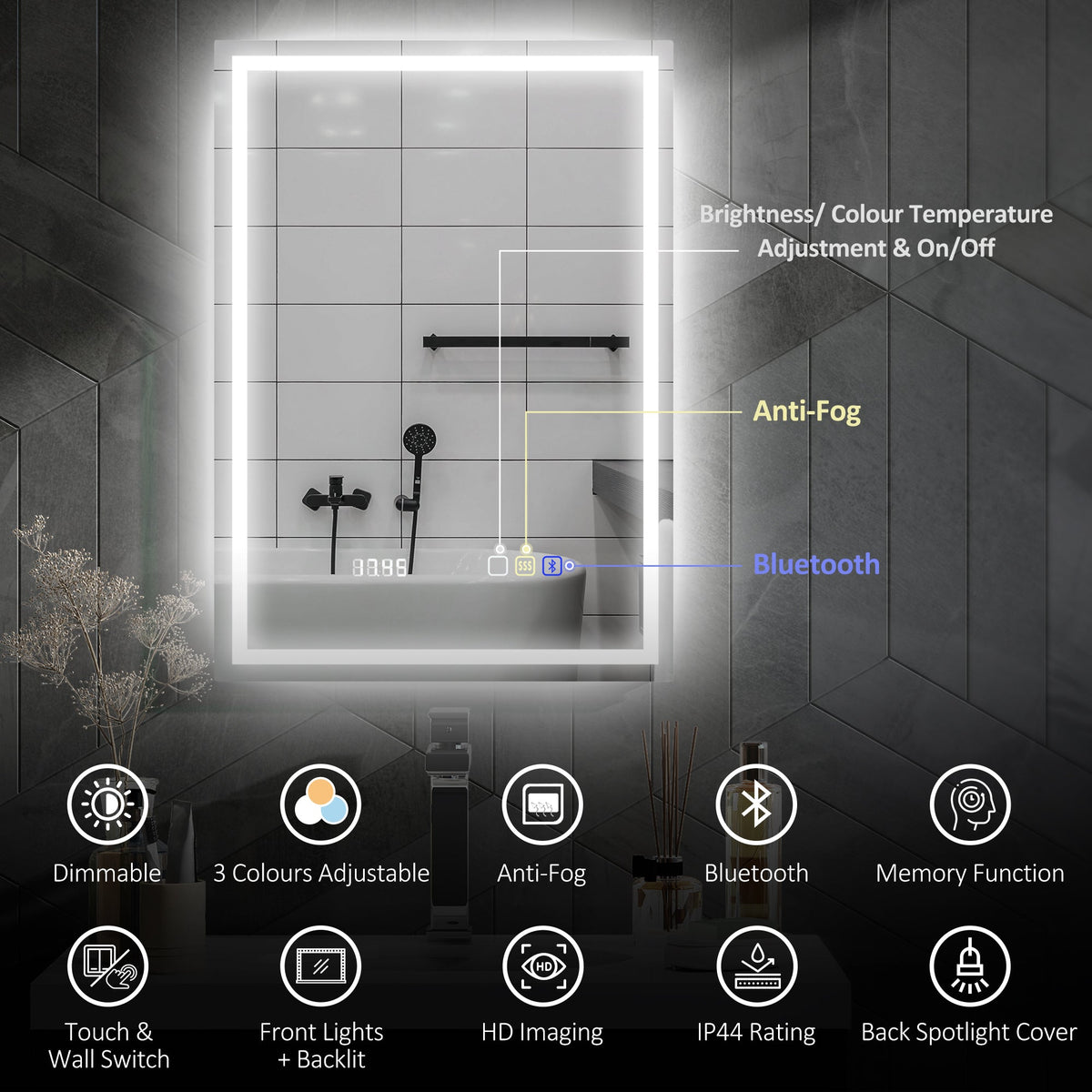 HOMCOM 50 x 70 cm Anti-Fog LED Bathroom Mirror, with Bluetooth and Clock - Silver Tone - Silver